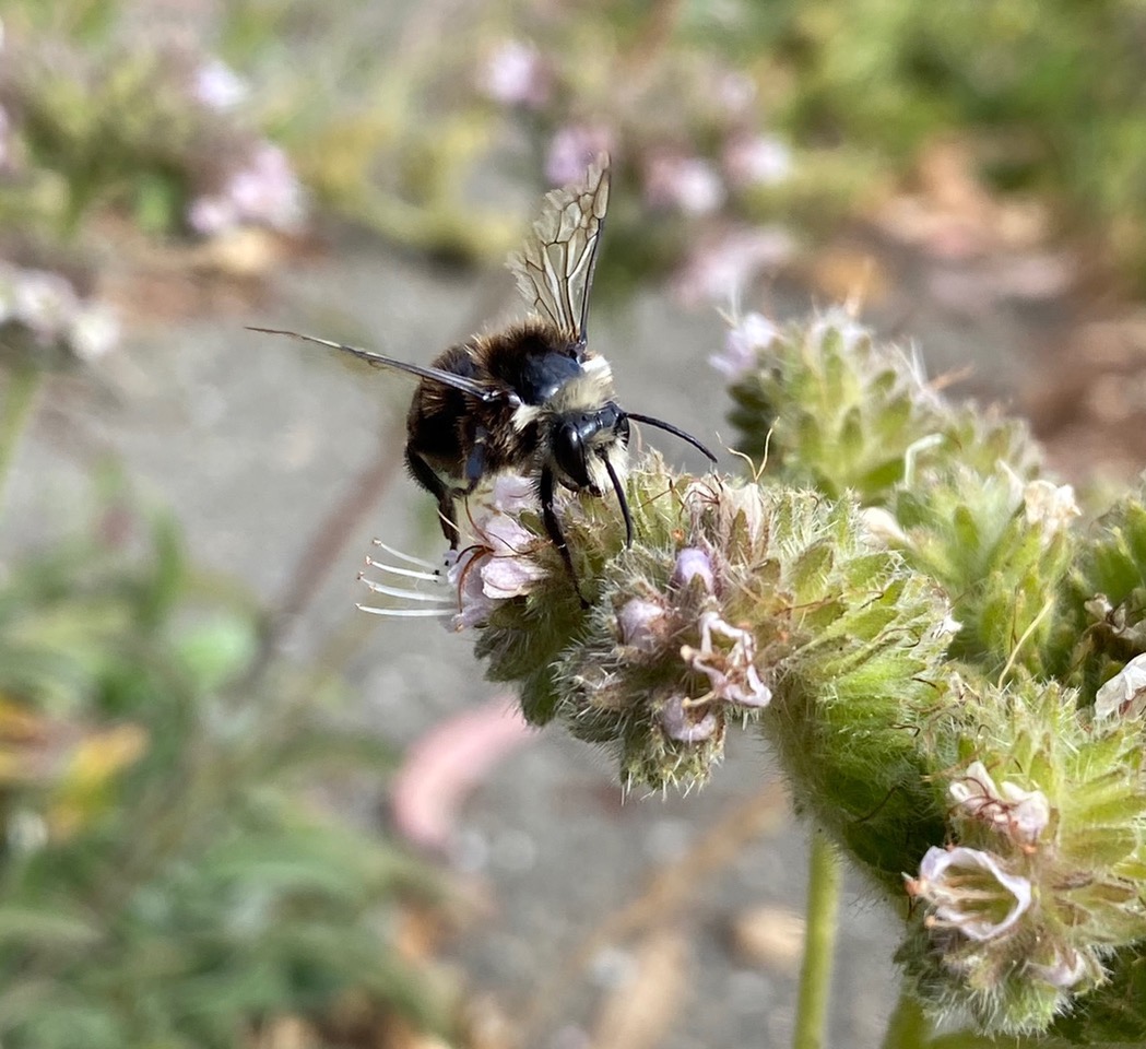 This Yellow-faced Bumble Bee, Bombus vosnesenskii (family Apidae) is showing her age. Her wings are tattered. Her hair is thinning. The yellow hairs have faded and the once jet black fur is losing its color as well. Yet she is still working hard, gathering floral resources for the colony.