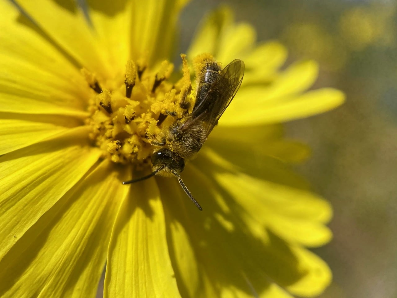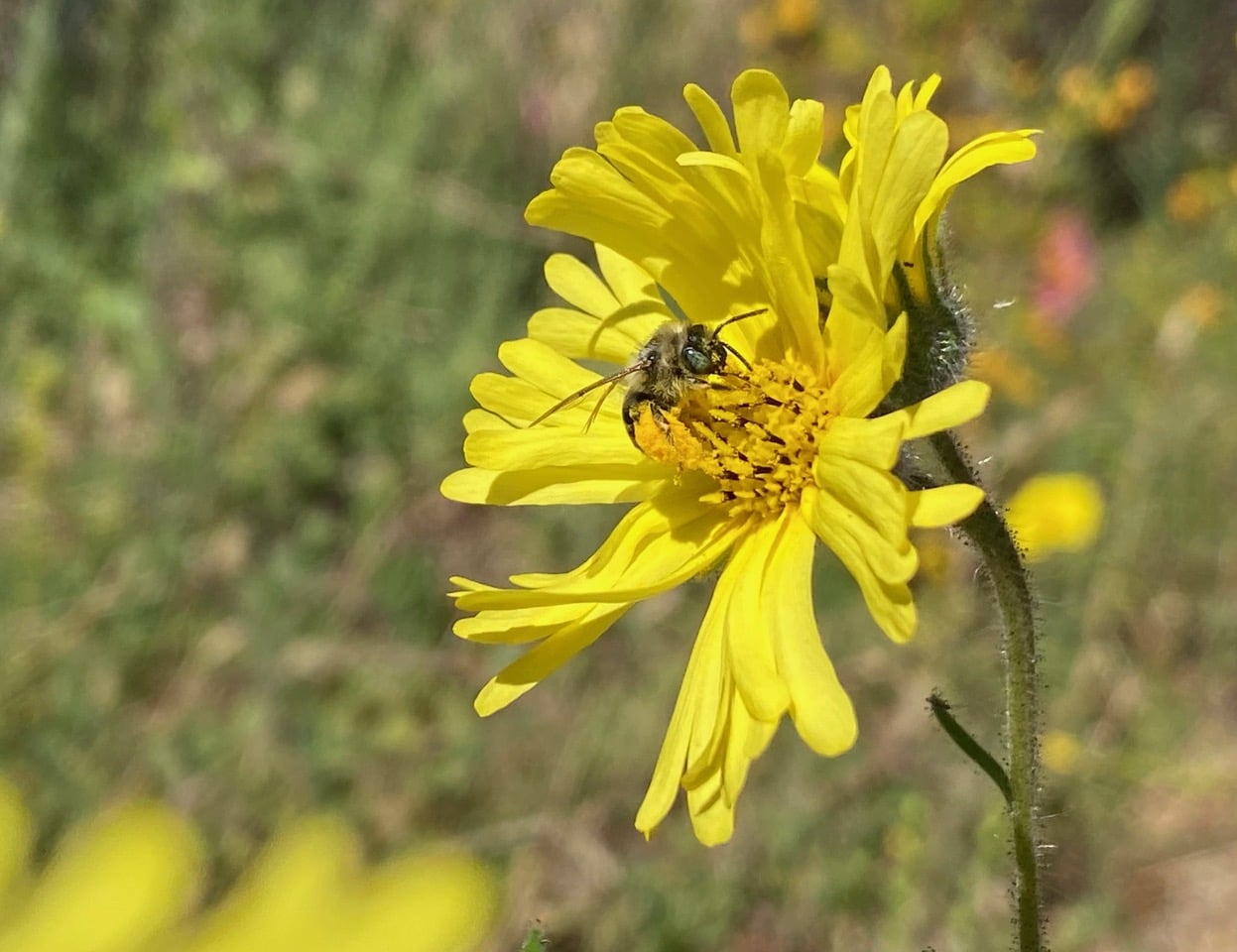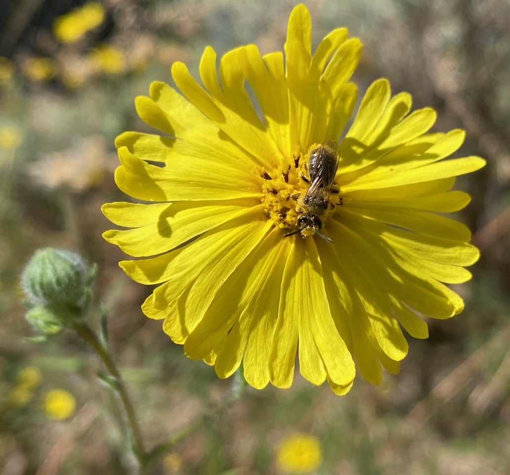 Who’s that bee covered with the sticky pollen of Elegant Tarweed?