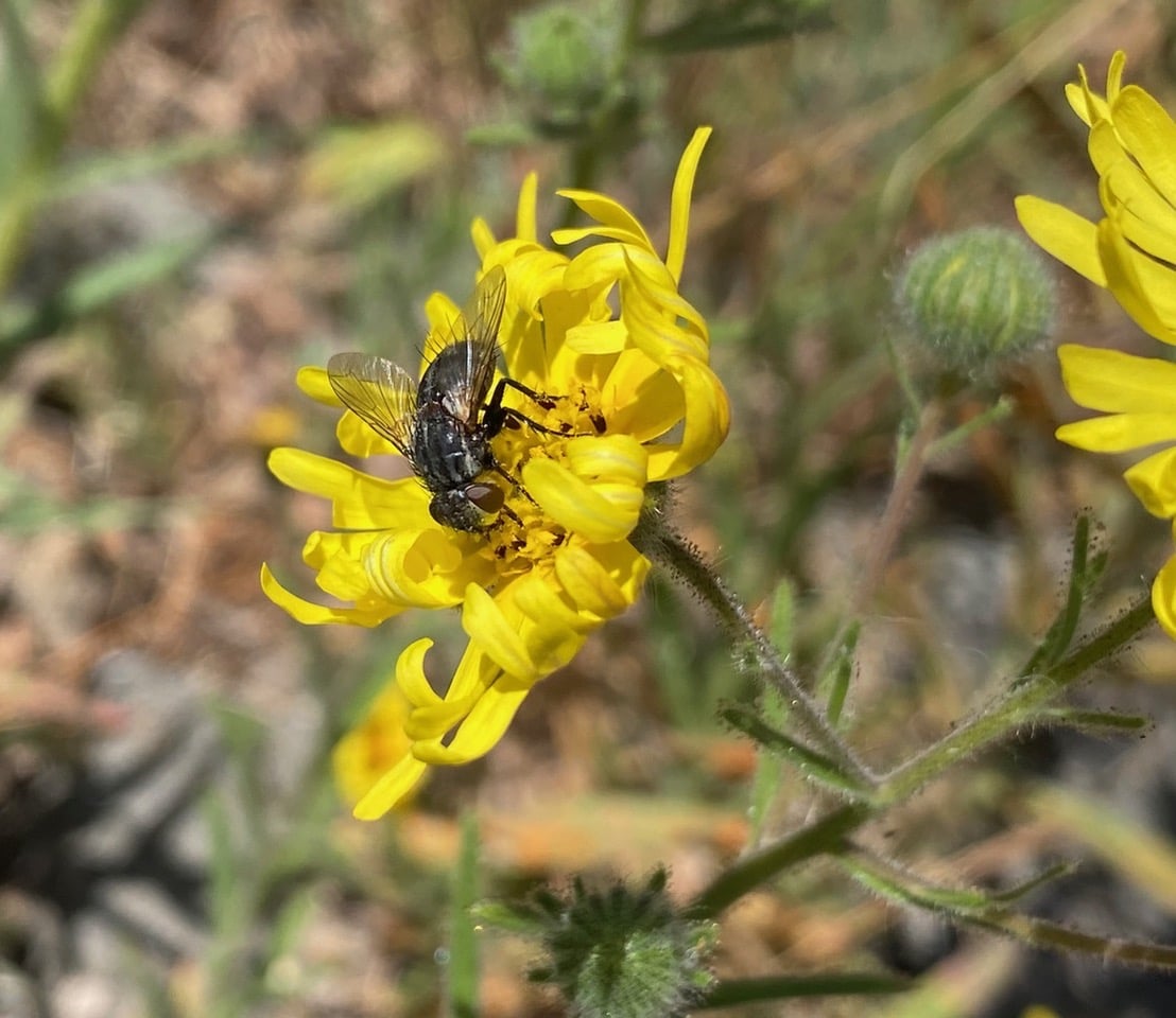 A Bristle Fly (family Tachinidae) is taking nectar from the flowers of Elegant Tarweed.
