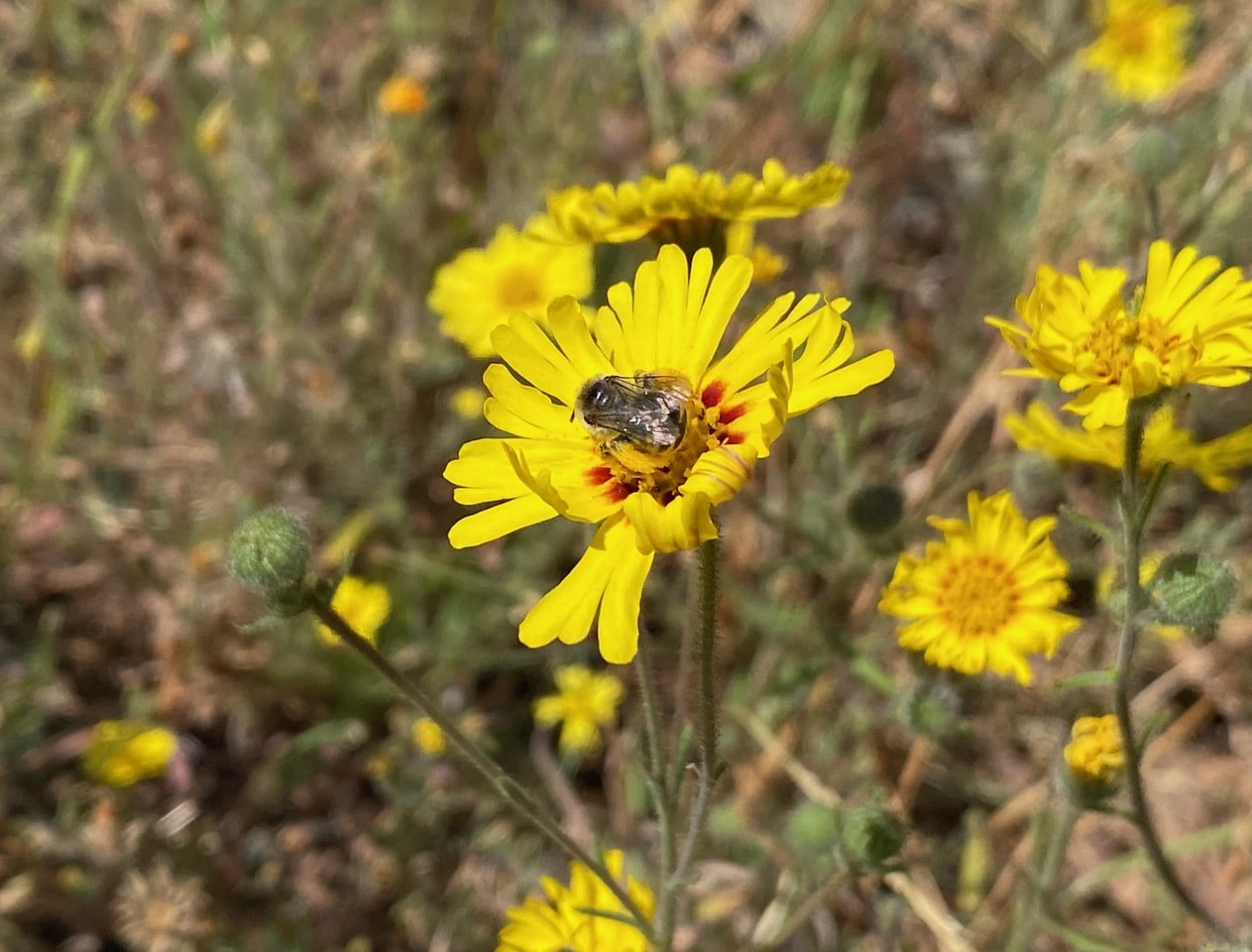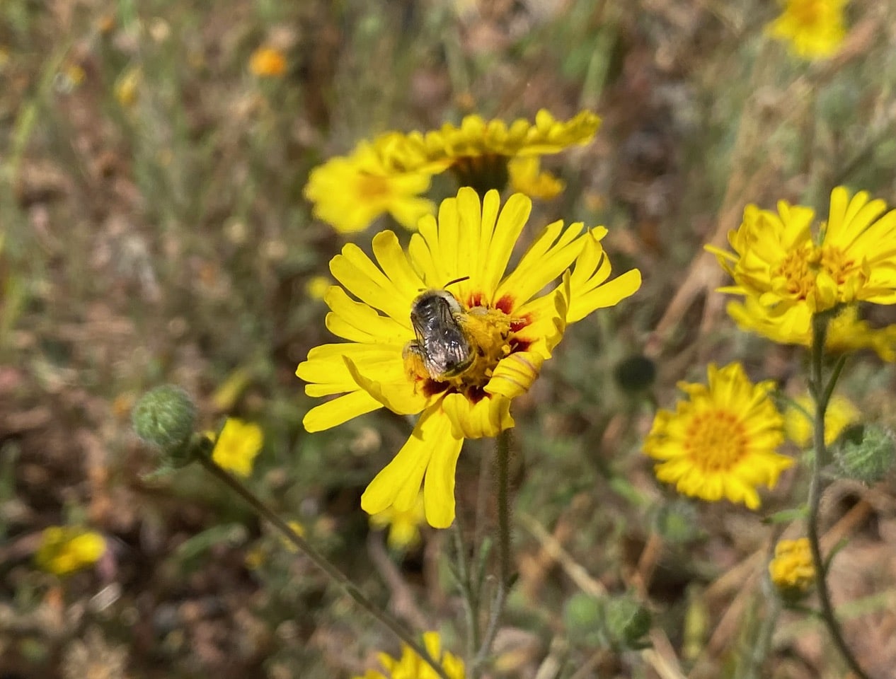 She also takes nectar from the flowers of Madia. Sometimes I wonder how she is going to lift off with that colossal load of pollen.