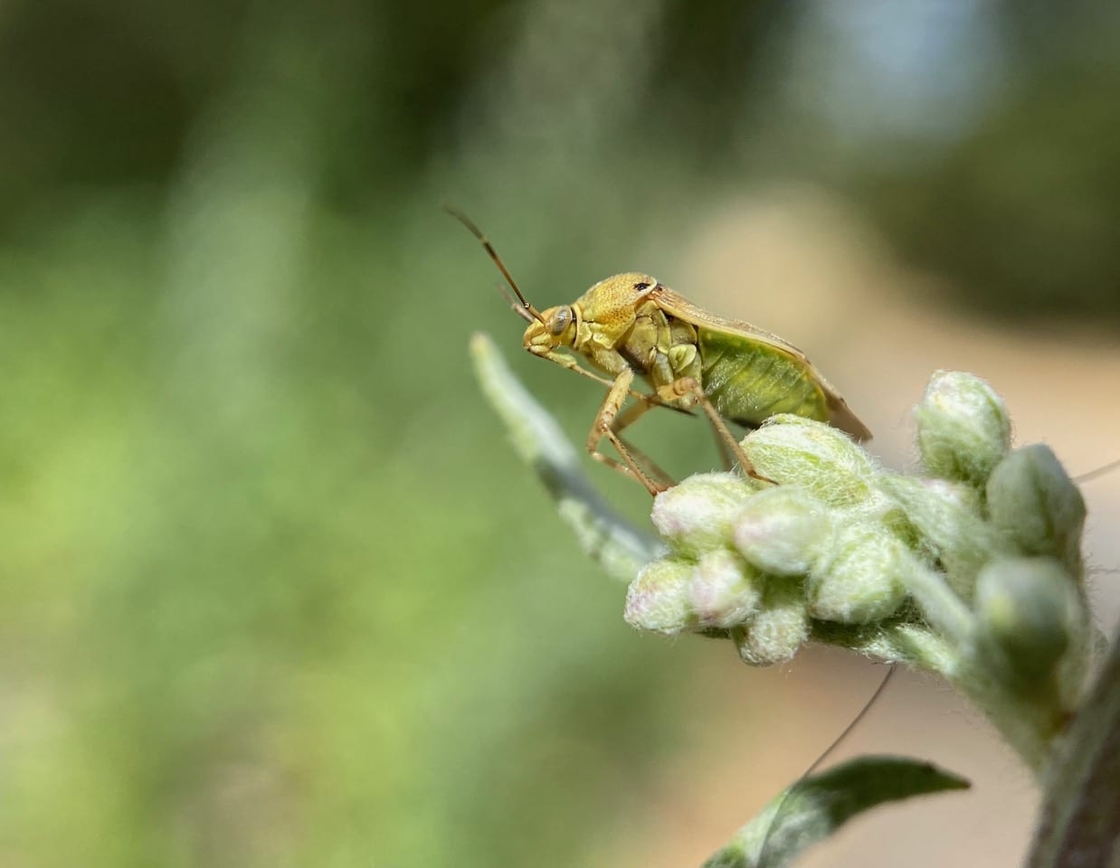A Lygus Bug, Lygus sp. (family Miridae, order Hemiptera) is standing stock still on a cluster of Mugwort flower buds. Note its needle-like mouthpart, the rostrum that is folded under the body.