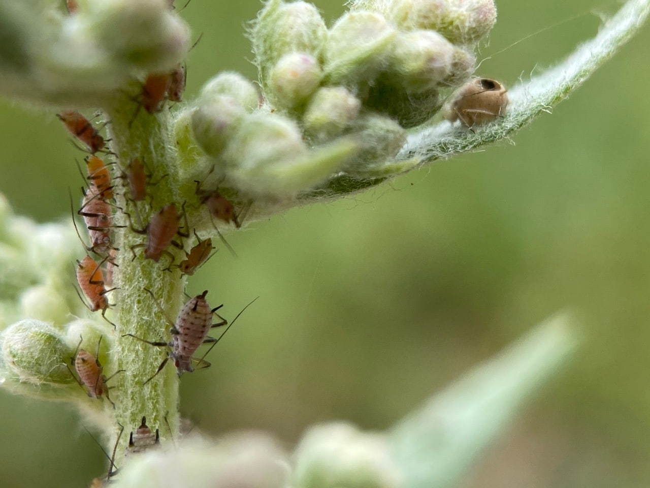 Here’s a view that shows the healthy aphids compared with the aphid mummy.