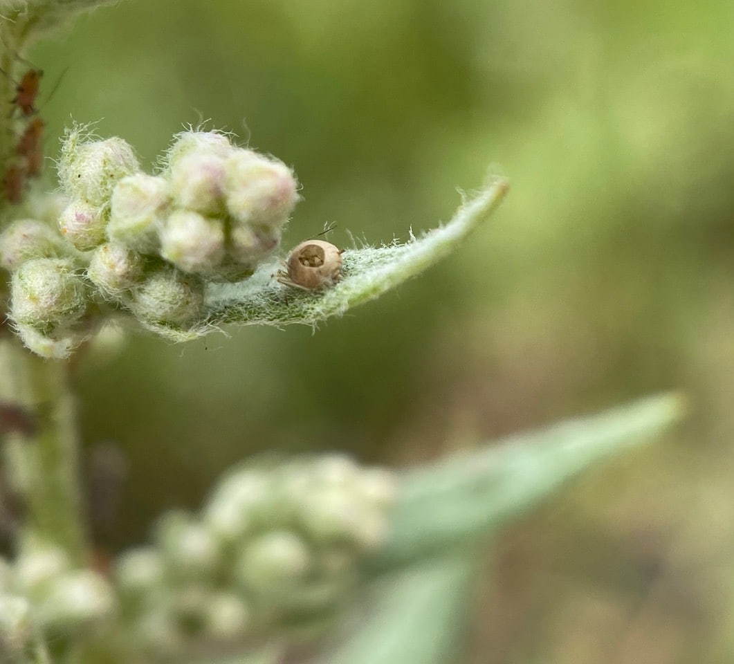 Passing the Mugwort, Artemisia douglasiana, I check on the colony of Anthemid Aphids, Macrosiphoniella sp. (family Aphididae) I found on the plant last time. The aphids are still there, but look at the bloated aphid “mummy” on the leaf. It appears to have company next to it – a thrips?