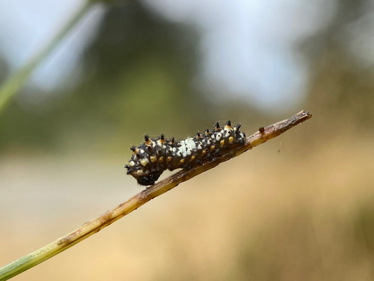 Hey, here’s a little caterpillar! It is probably a second instar, with a patch of white across its mid section, appearing like bird poop. Swallowtail caterpillars are well-known for their bird-poop mimicking larvae in their early instars. The disguise likely keeps the caterpillars safe from hungry birds until they are more mobile.