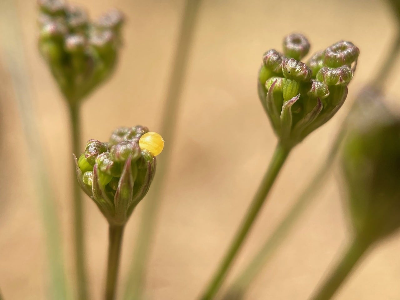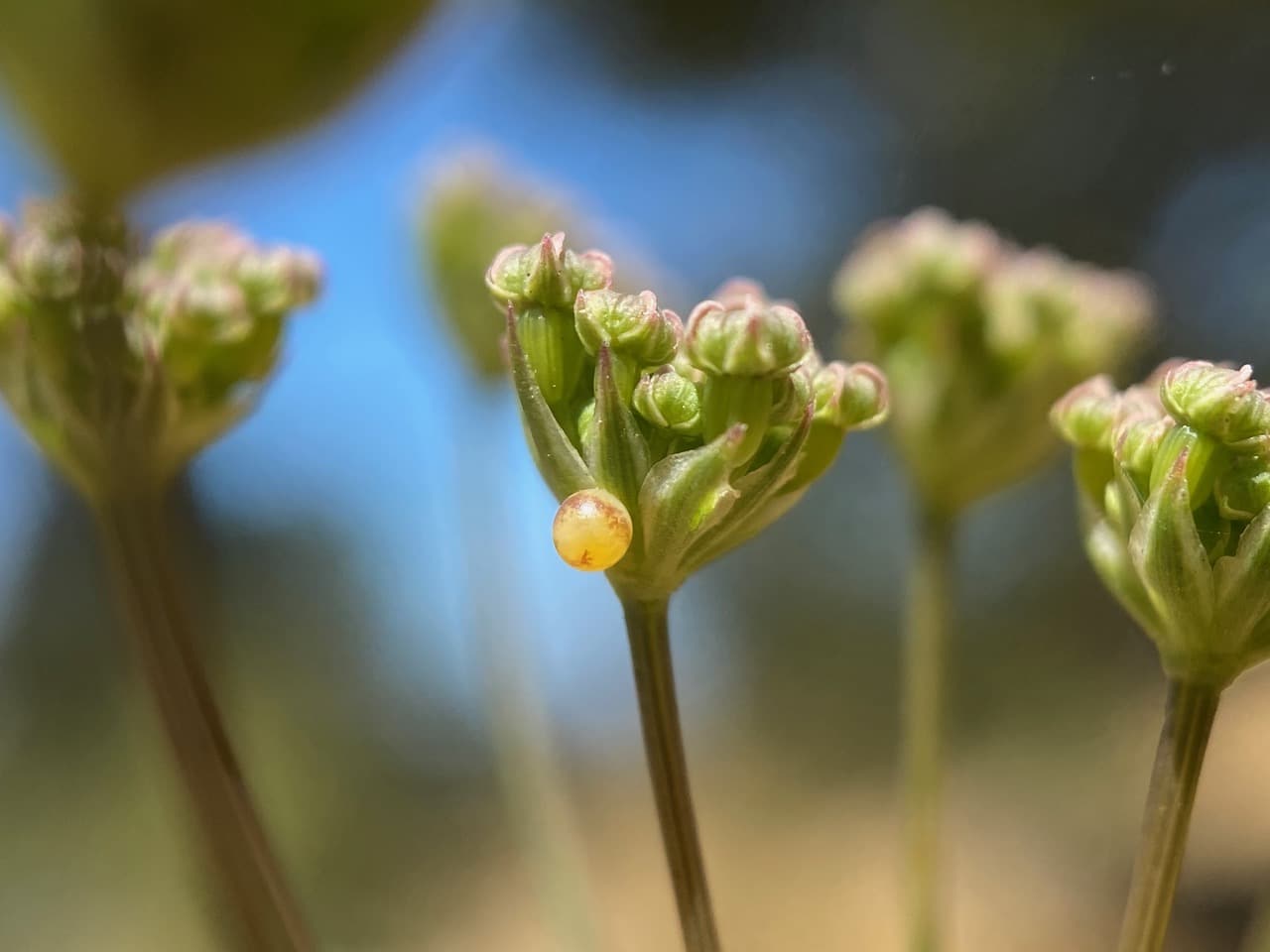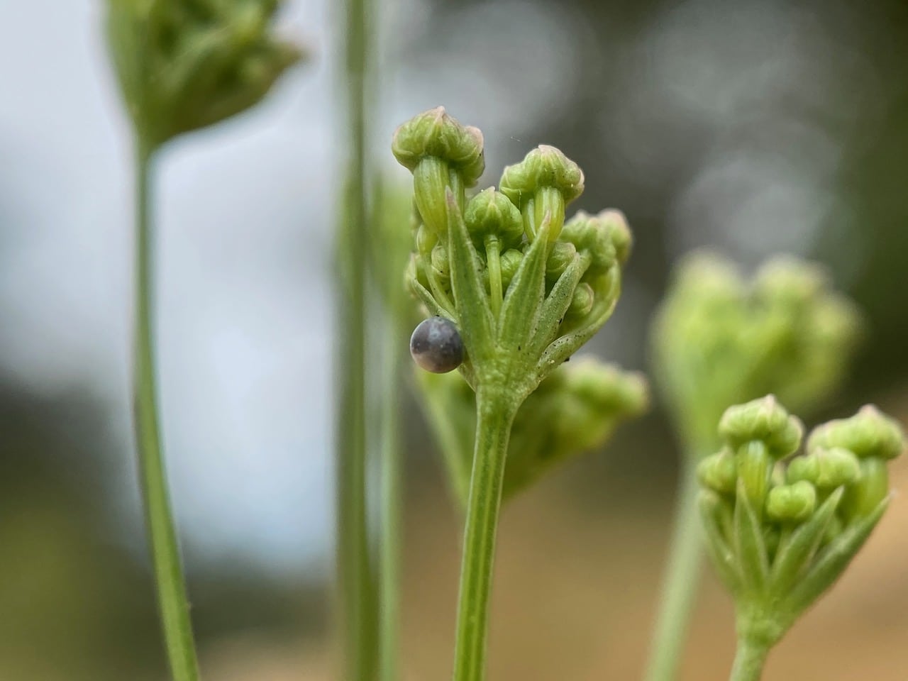 A male bee seems to be fast asleep atop an umbel of Yampah flower buds. The light is too dim for me to identify the bee.