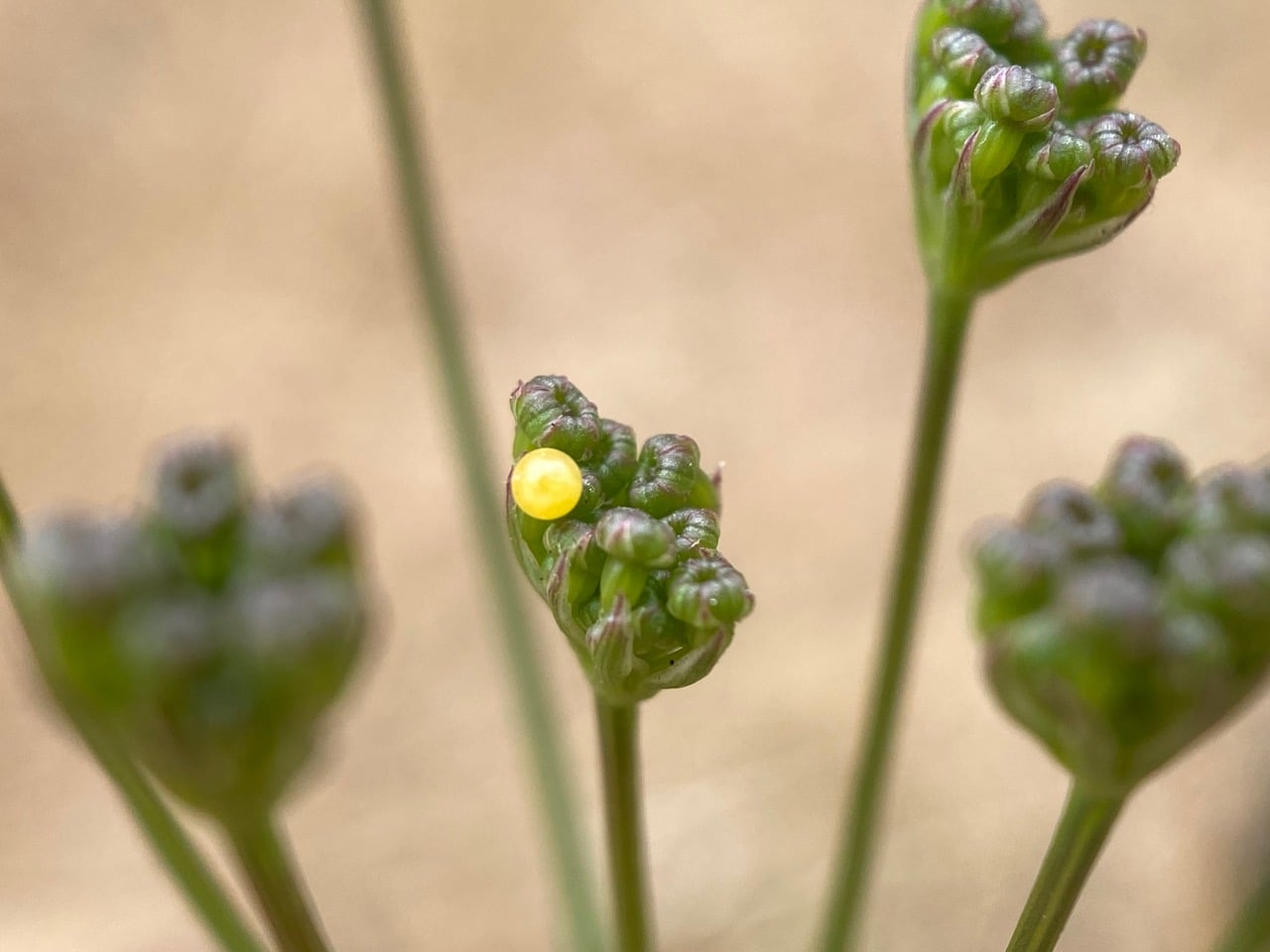 I am glad that the brush clearing along the paved road has spared the nice stand of California Yampah, Perideridia californica (family Apiaceae) among the weedy grasses. Checking the tight flower buds in the umbels on top of the tall stalks, I am delighted to find eggs of the Anise Swallowtail butterflies. Although I have been finding the eggs of this species on Fennel in the park, this is the first time this year that I find them on a native plant. The smooth, globular eggs are laid singly on the host plants which are mostly species in the parsley family (Apiaceae).