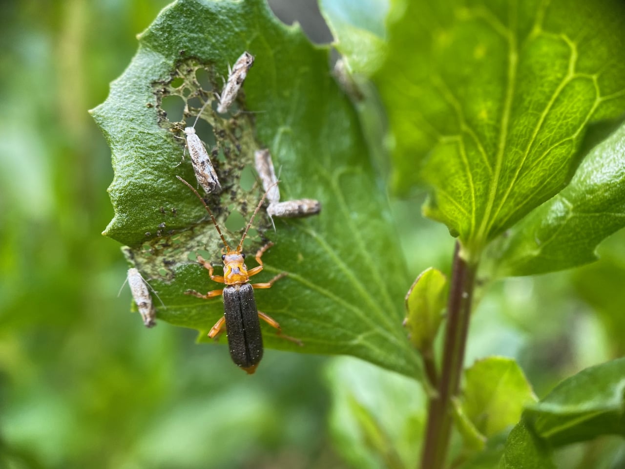 I decide to walk along the trail to find out what other insects might be doing at this hour. A pair of Soldier Beetles, Cultellunguis americanus (family Cantharidae) is mating on a Cow Parsnip leaf, Heracleum maximum.