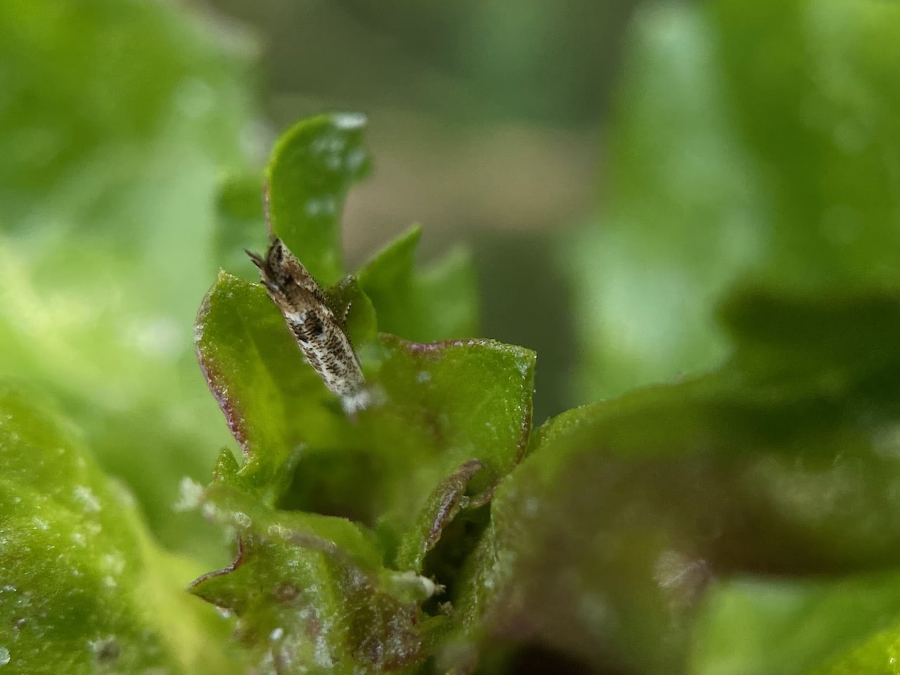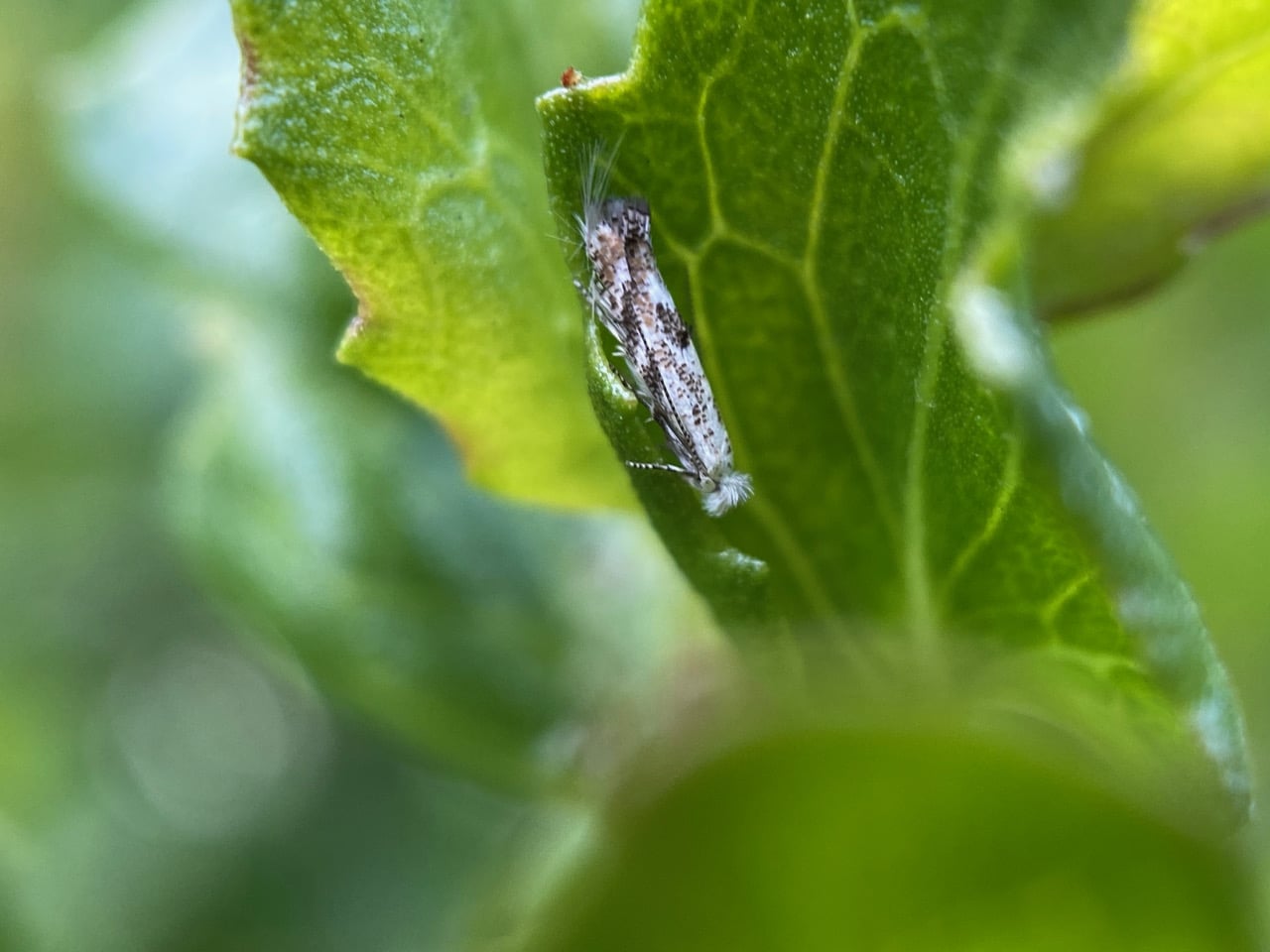 A few moths have gathered around a feeding scar on a Baccharis leaf, apparently feeding on the oozing sap or debris.