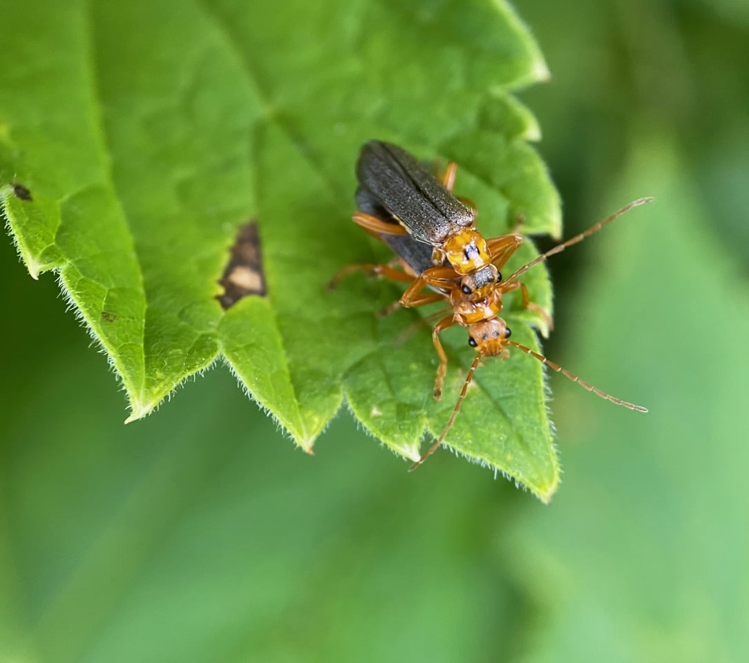 At the edge of the same leaf, another pair of Soldier Beetles is making out in a different position. There are also several single beetles milling around on the leaf. Is this the neighborhood singles bar?