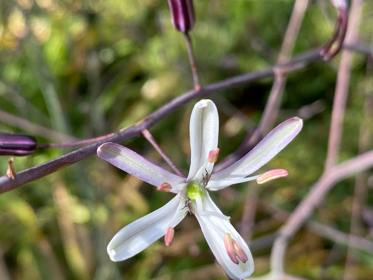 A Western Calligrapher, Toxomerus occidentalis (family Syrphidae) lands of a spent flower of Soap Plant, Chlorogalum pomeridianum. Is she waiting for the next round of blooming tonight?