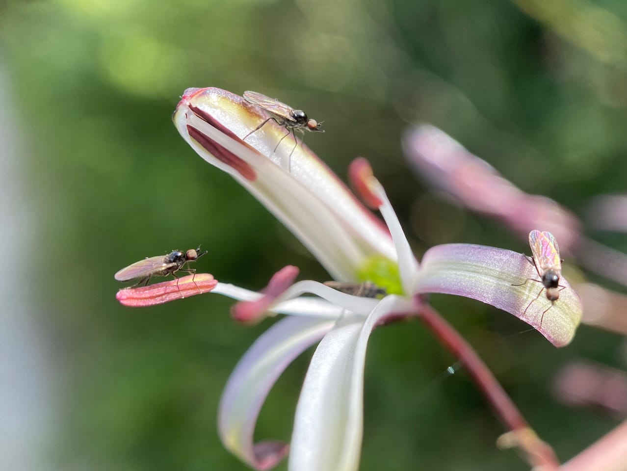 A few Soap Plant flowers are starting to open up, attracting many Dance Flies. The flies stake out various positions on the flower in anticipation of the nectar flow.