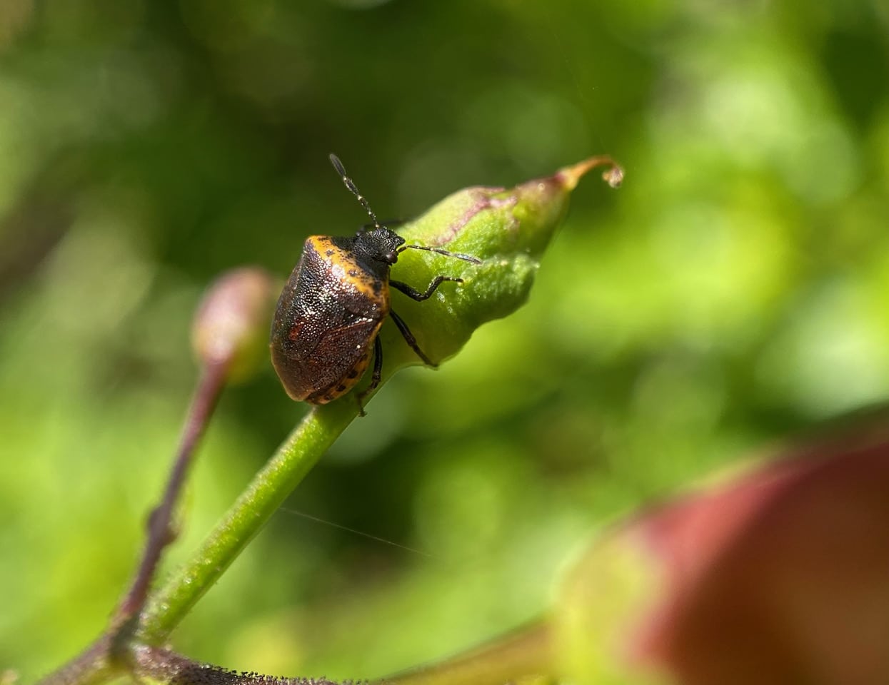 A small Stink Bug, Cosmopepla uhleri (family Pentatomidae) is climbing onto a California Bee Plant flower bud. The bug is easily recognizable – black with an orange transhumeral band with black spots. The bug uses Scropularia californica as a host plant.