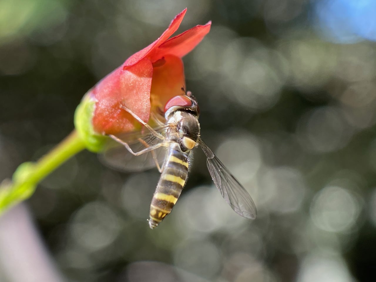 Backlit by the low sun, the abdomen of a Diamond Spottail, Fazia micrura (family Syrphidae) appears translucent as it forages on a California Bee Plant flower.