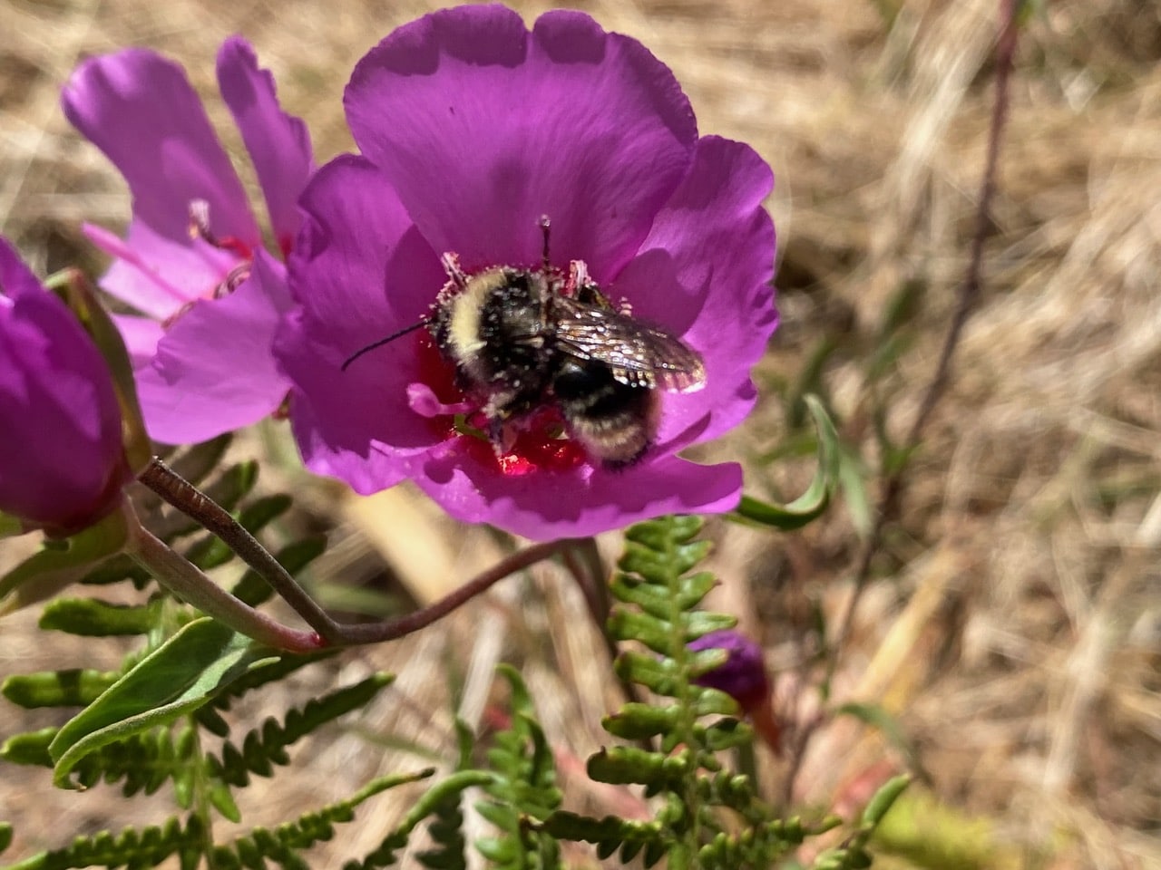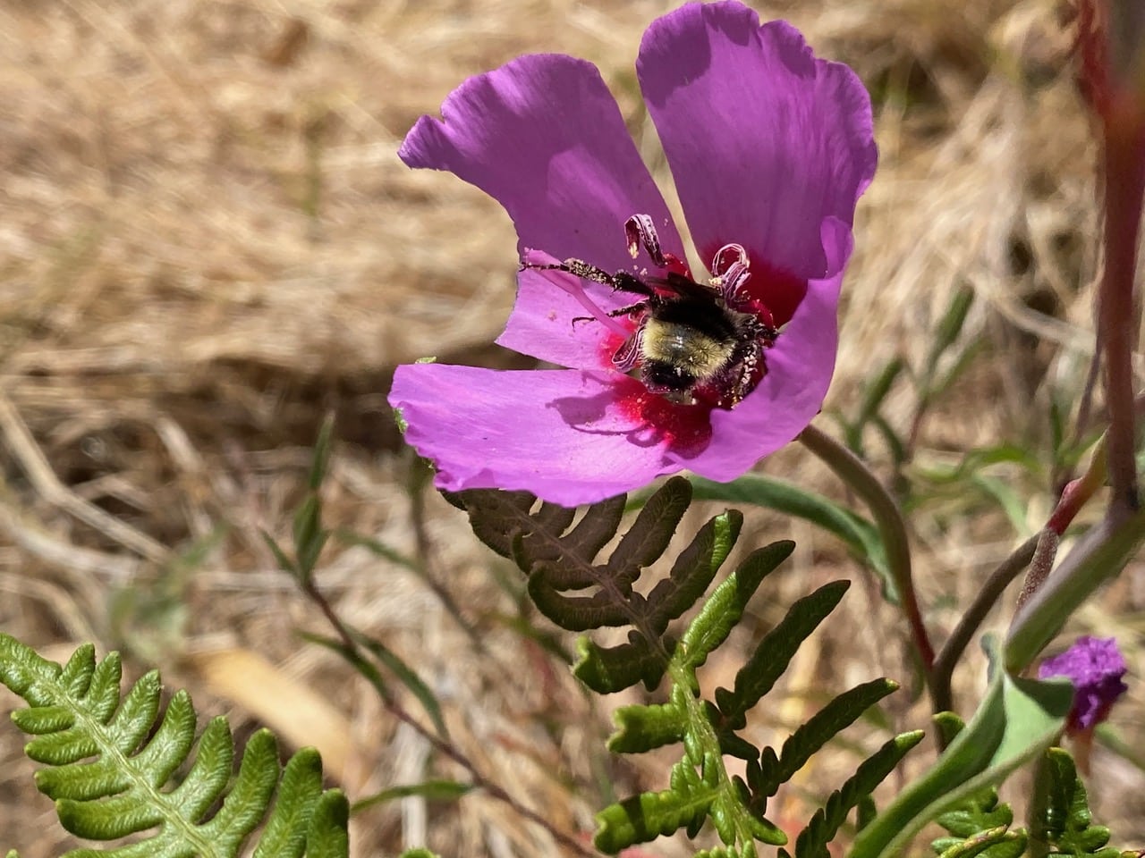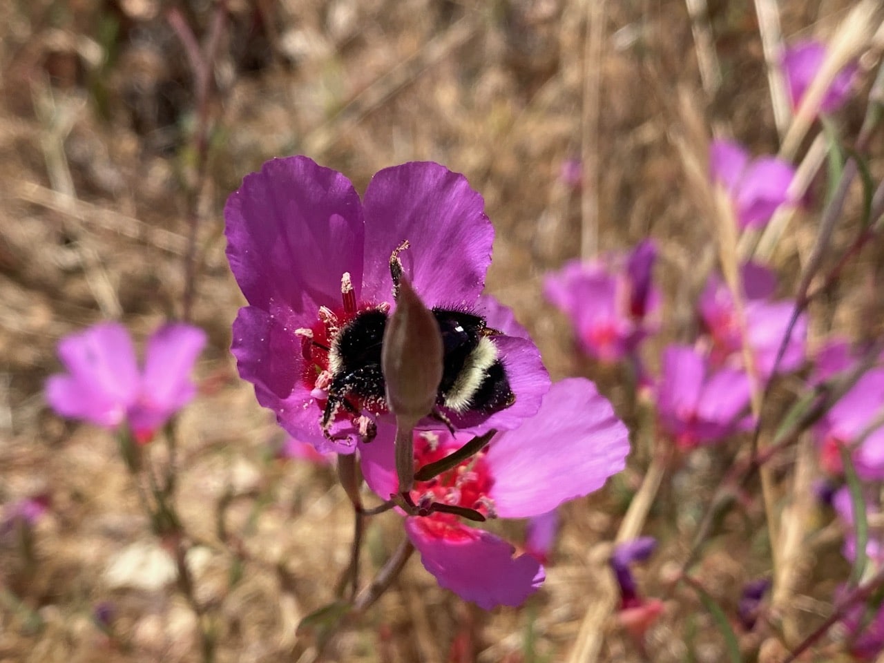 Alerted to the presence of California Bumble Bees, I am paying attention to every large bumble bee I come across now. Here’s one taking nectar from a Farewell-to-spring, Clarkia rubicunda.