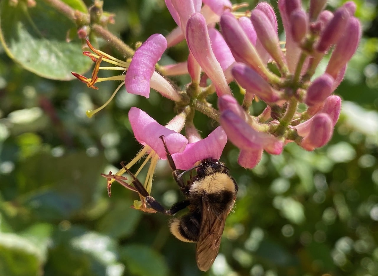 A large bumble bee lands on an inflorescence of California Honeysuckle, Lonicera hispidula, and proceeds to take nectar from the flowers.