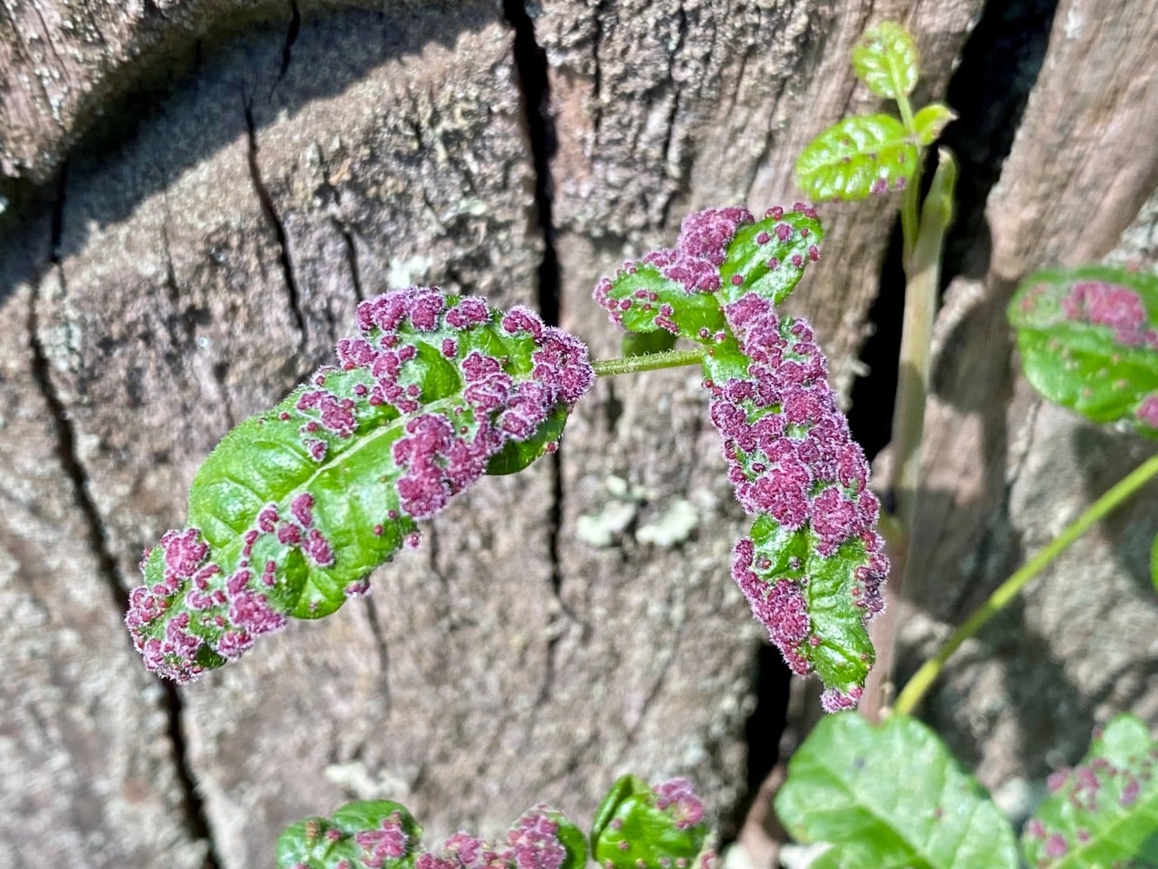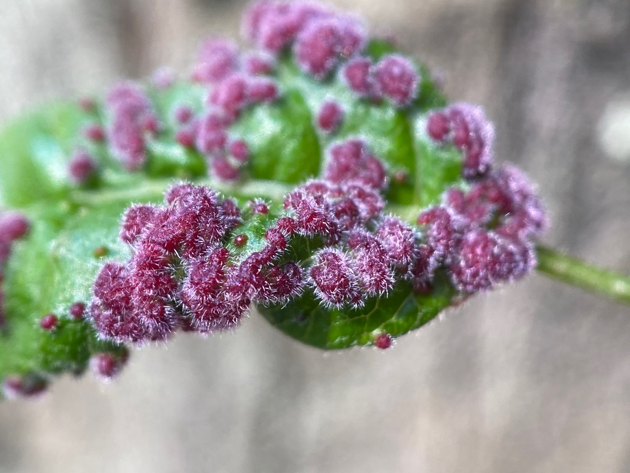 Close-up of the swellings show that they are covered with short white hairs. These growths are leaf galls induced by Gall Mites in the family Eriophyidae.Eriophyid Mites are microscopic mites that often go undetected. Unlike most adult mites that have four pairs of legs, eriophyid mites have only two pairs. They are slow-moving, usually white or yellow in color, and have a distinctive “carrot” shape. They are very host-specific. Most eriophyid mites make their home on the surface of leaves where their feeding can cause bronzing or reddening but some are also responsible for creating galls on leaves or witches’-broom on stems and flower buds. Adult females overwinter in cracks and crevices of twigs and bud scales. Females lay eggs in the spring. The young mites that hatch out resemble the adults. Numerous generations are produced each year. They are primarily spread by wind.