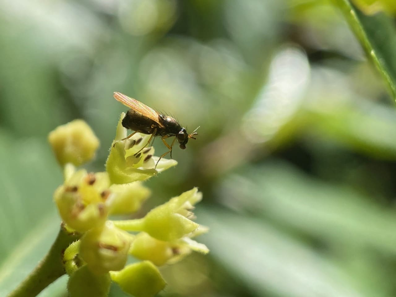 An unidentified fly is perched on a flower of Coffeeberry, Frangula californica. Rather strange mouthpart and antennae.
