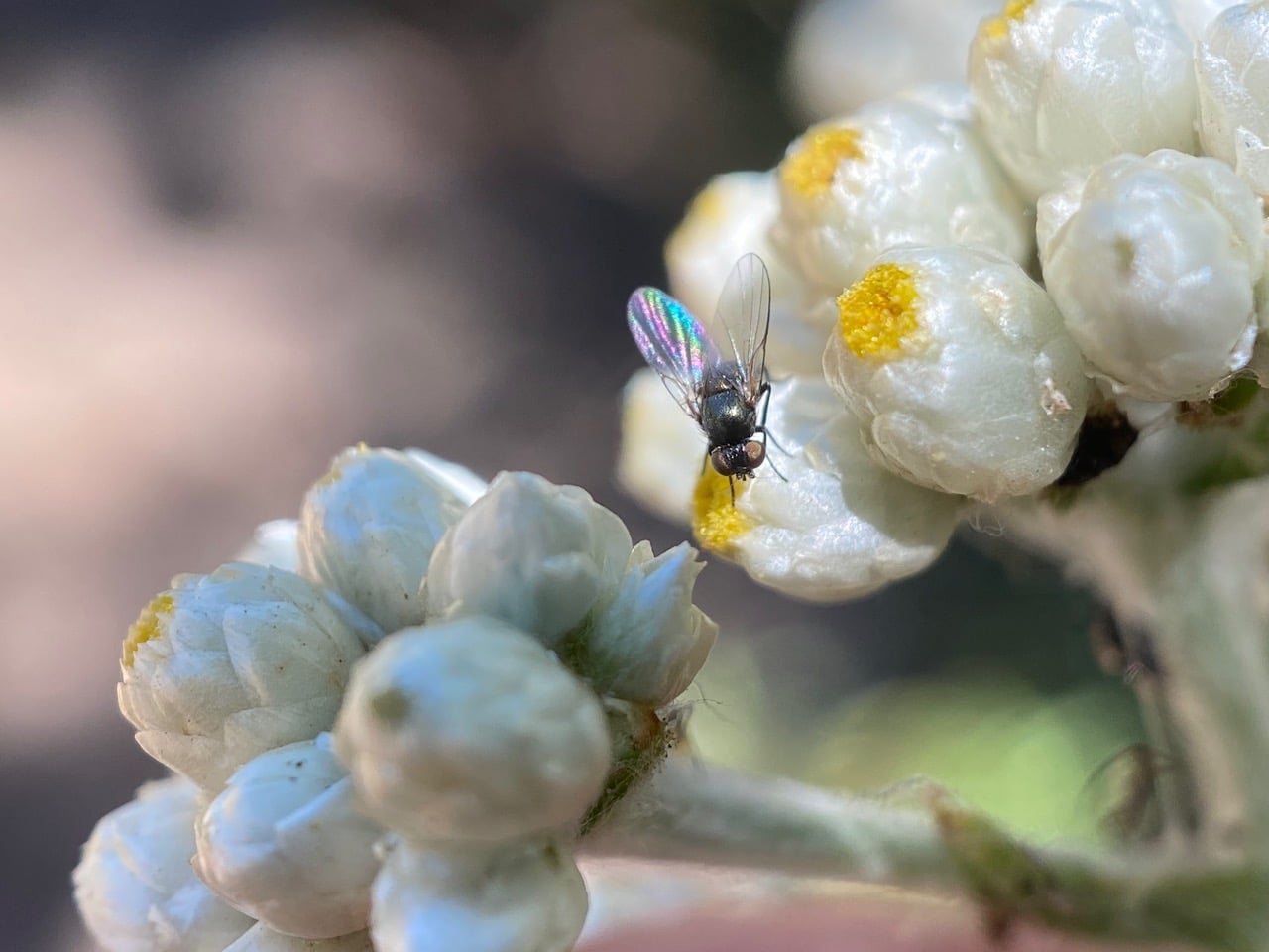 A tiny fly is feeding on an open flowerhead of California Everlasting.