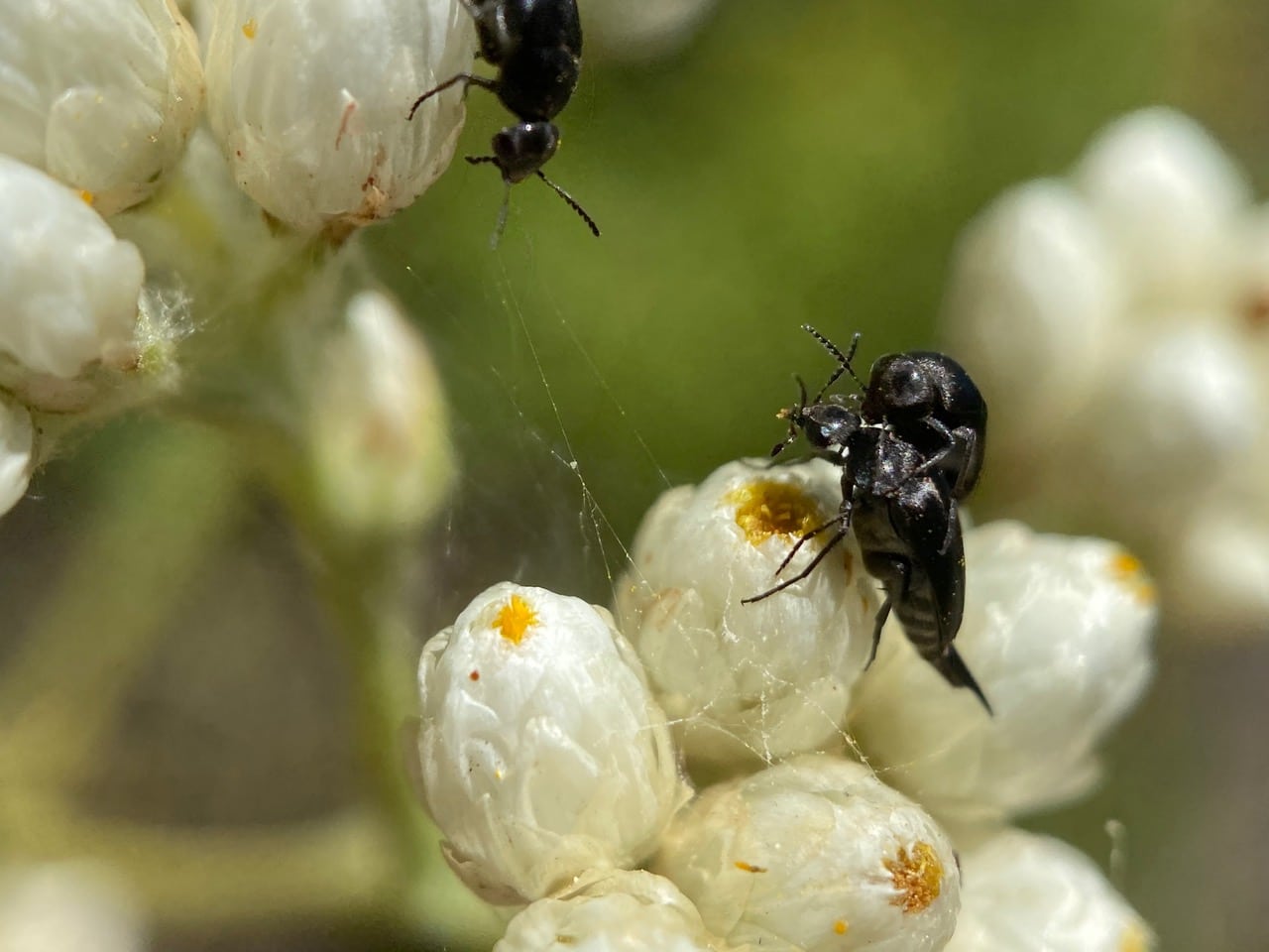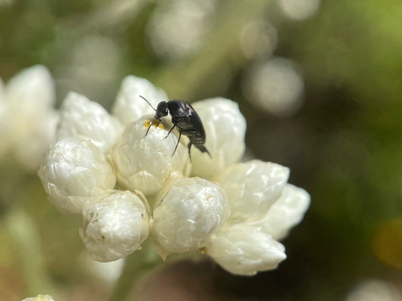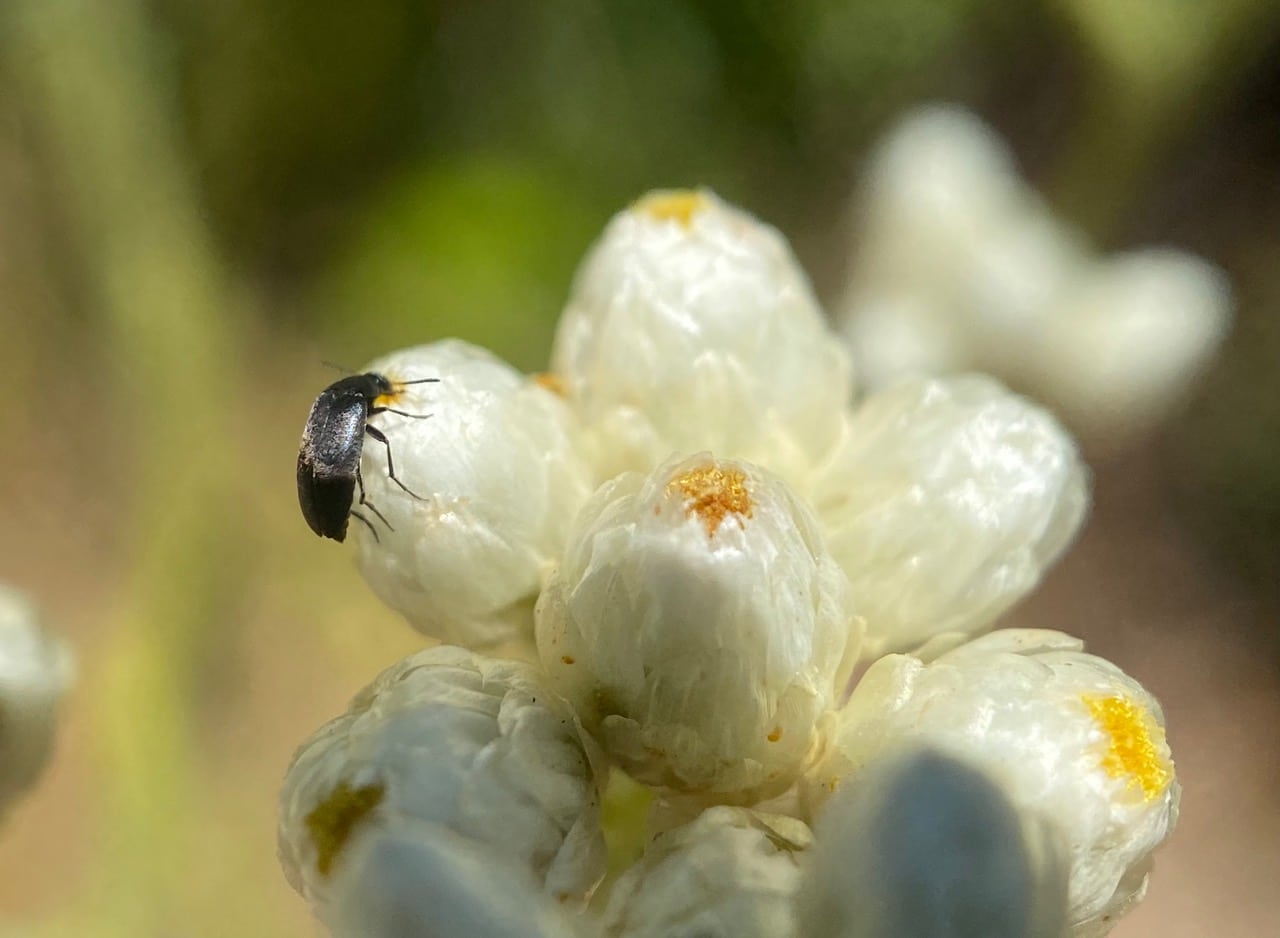 A Tumbling Flower Beetle (family Mordellidae) is enjoying the hidden abundance offered by the flowers of California Everlasting.