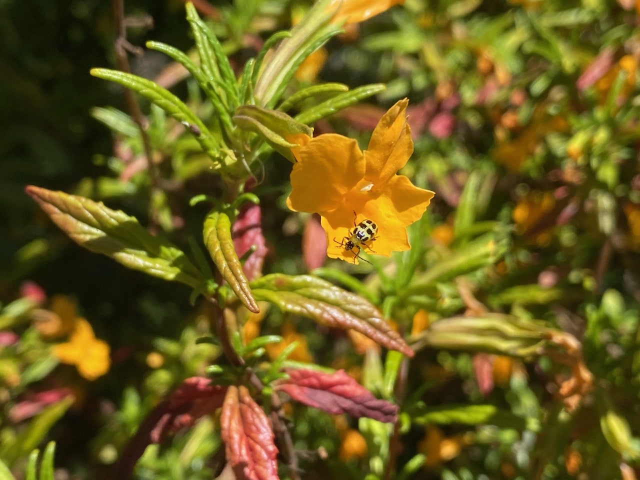 A Spotted Cucumber Beetle, Diabrotica undecimpunctata (family Chrysomelidae) wanders on the lower lip of a Sticky Monkeyflower, Diplacus aurantiacus. While the plant continues to bloom gloriously, its leaves are beginning to turn reddish bronze, a sign of heat stress. Interestingly, very few small bees are visiting the flowers today. Do heat and drought affect nectar production in flowers?