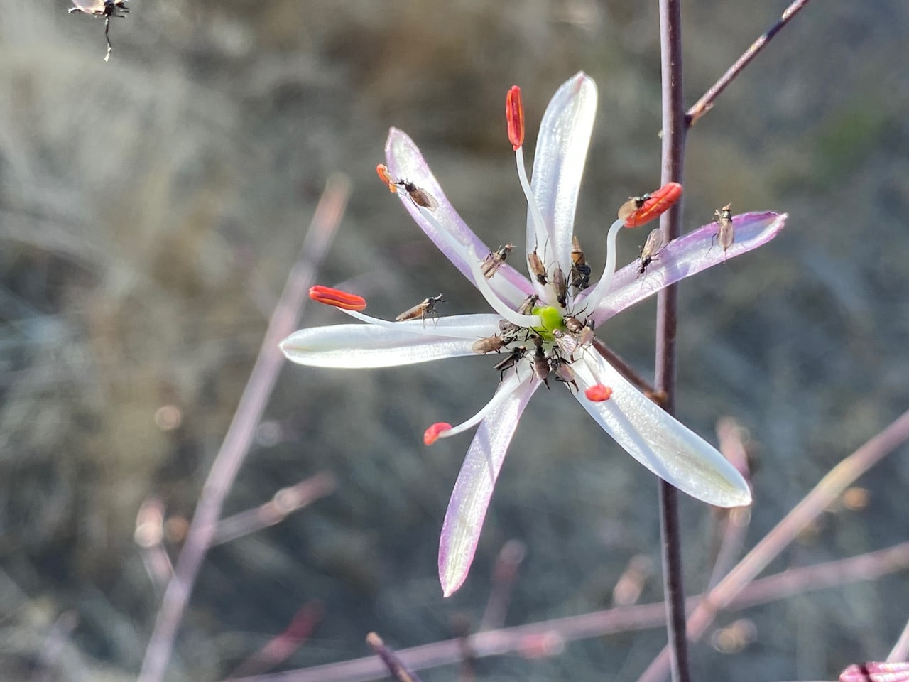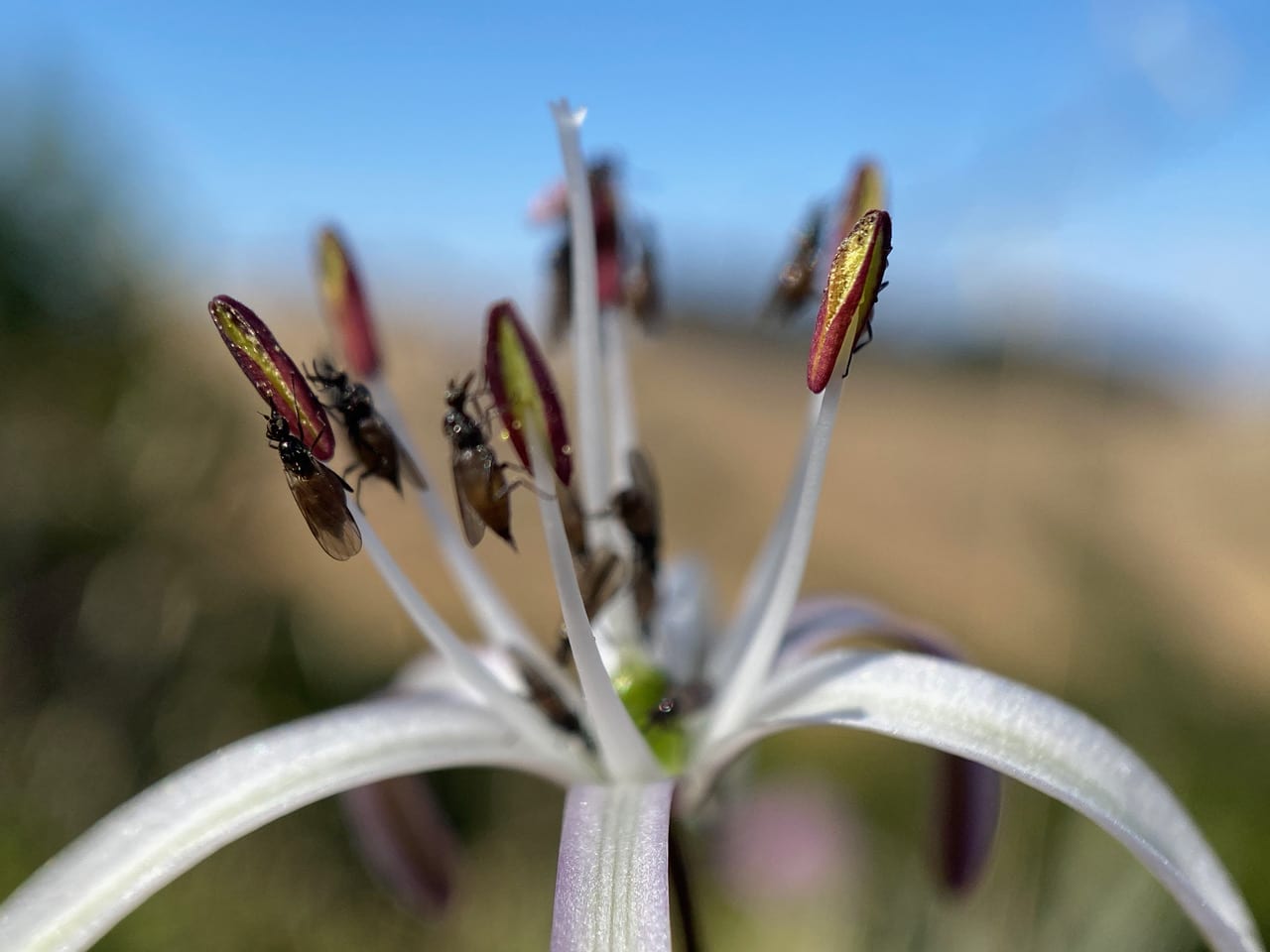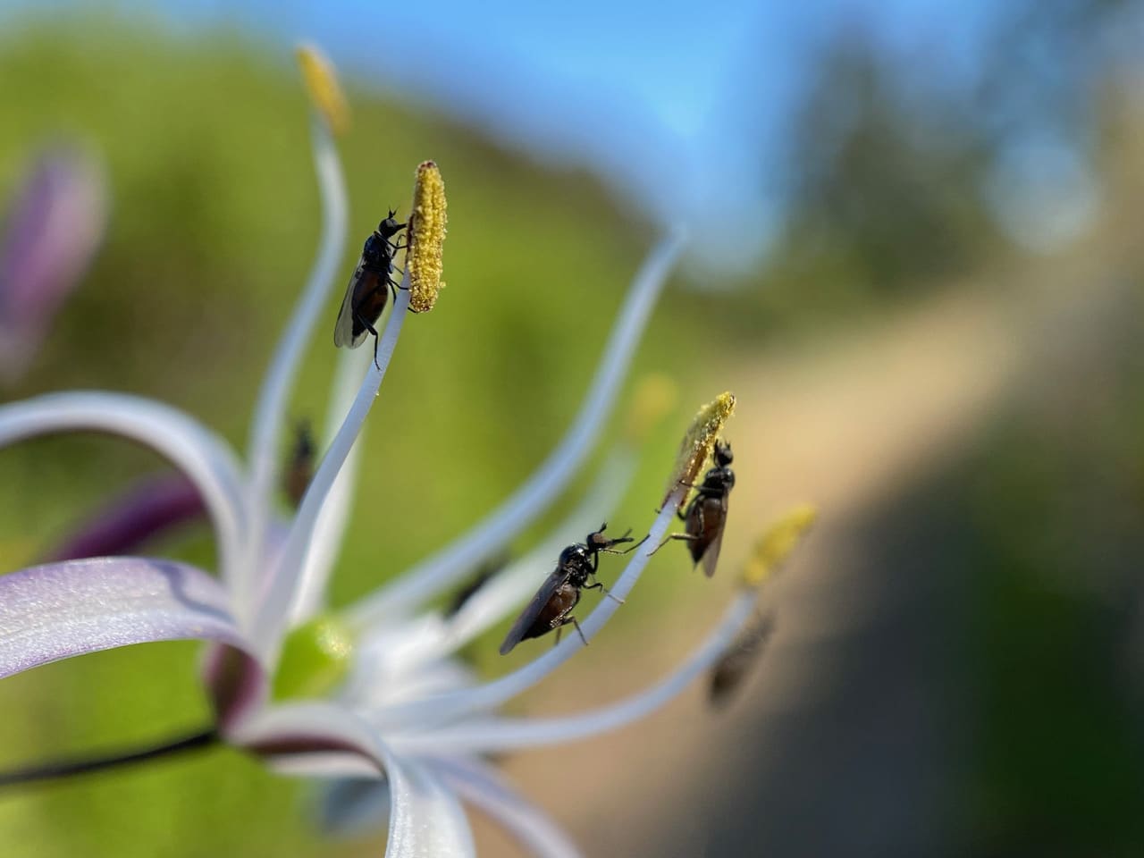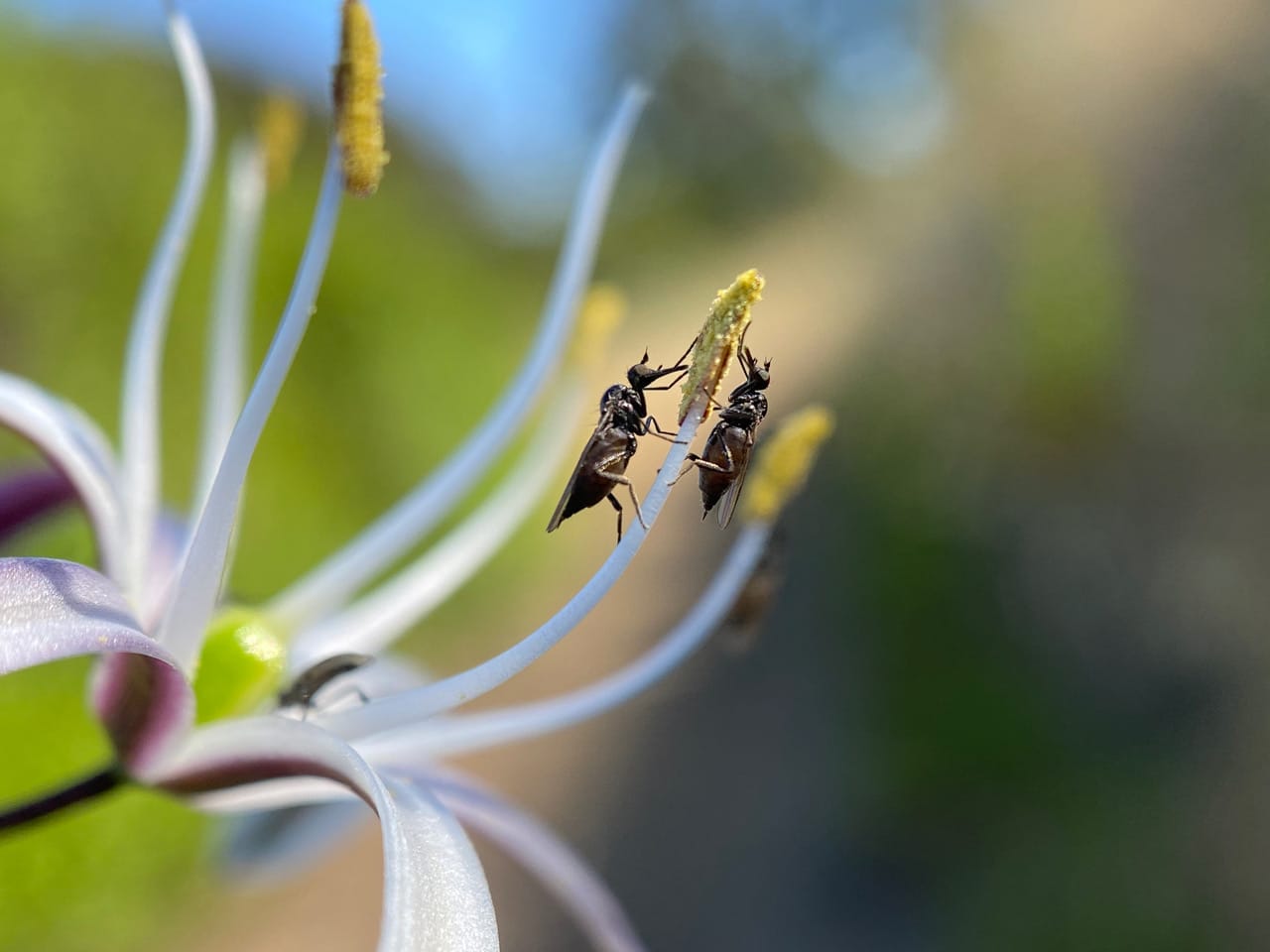As the anthers gape open to release pollen, the Dance Flies head upward for the feast.