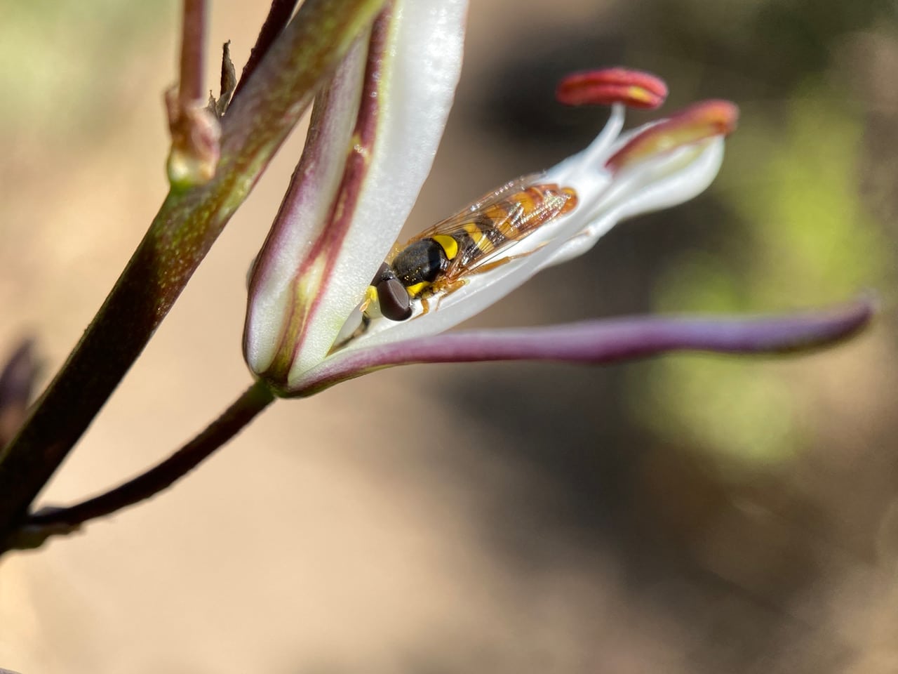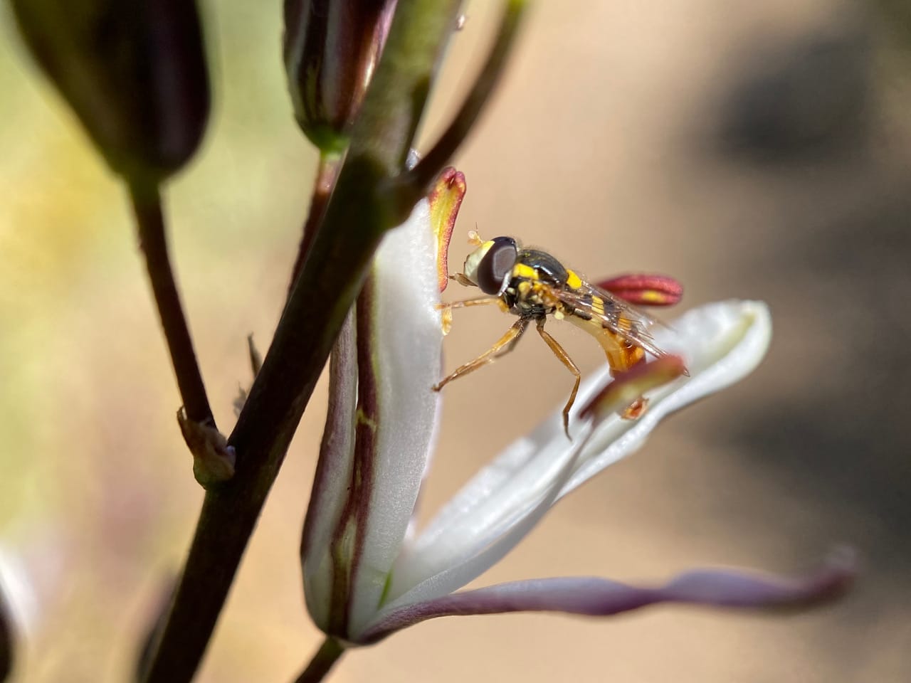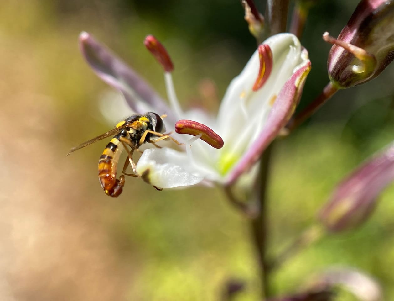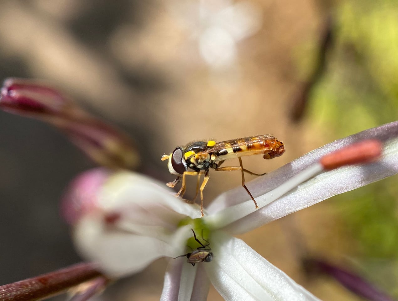 As the anthers gape open to release pollen, the Dance Flies head upward for the feast.