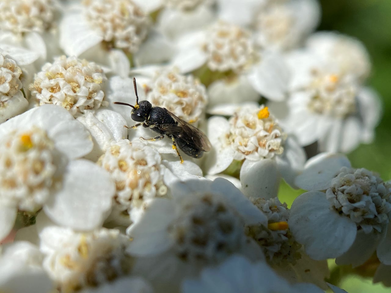 A Masked Bee, Hylaeus sp. (family Colletidae) about the size of a grain of rice, is foraging on an infloresence of Yarrow, Achillea millefolium. This is a female, but you’d never see a scopa on the body, whether male or female.