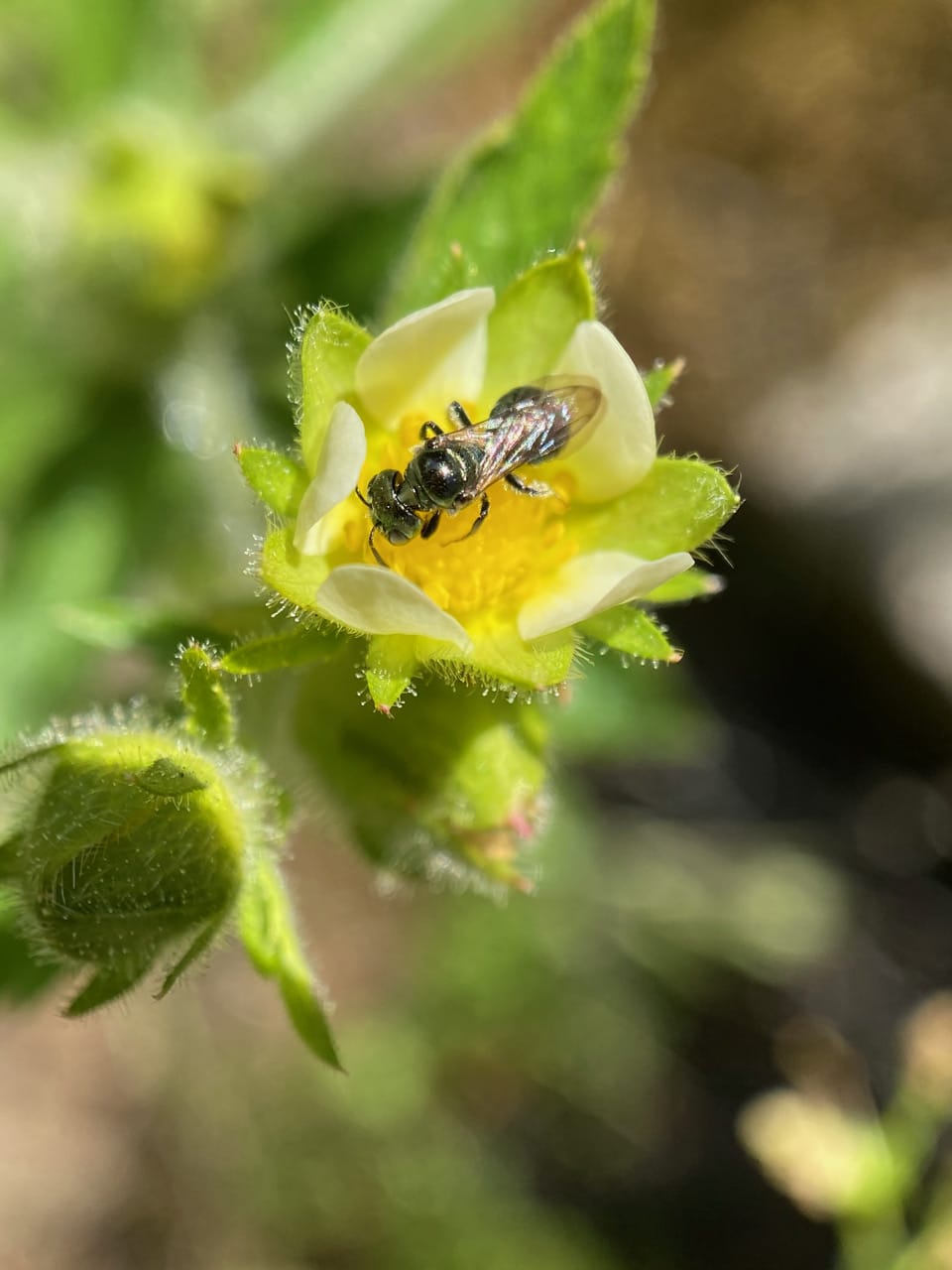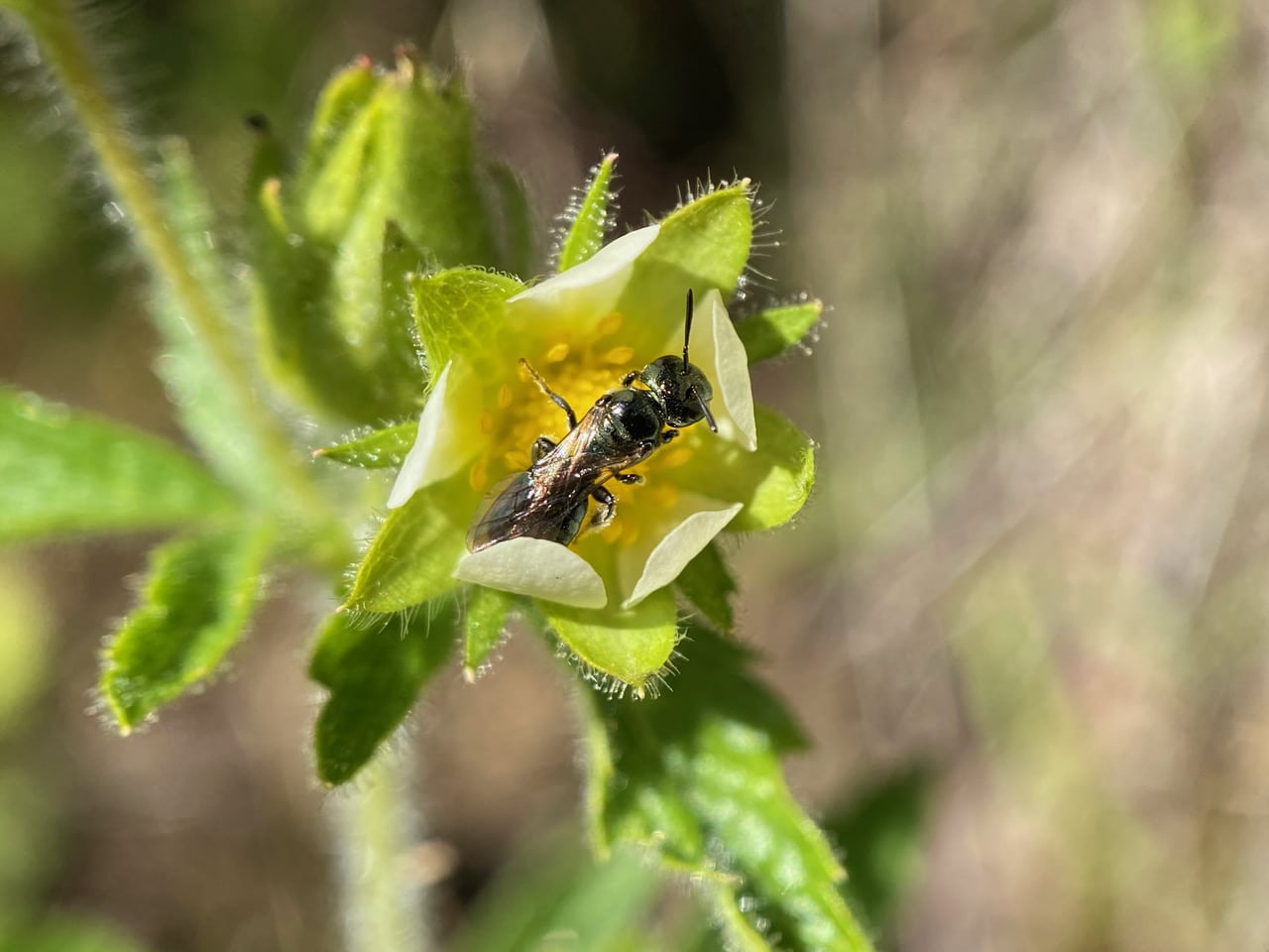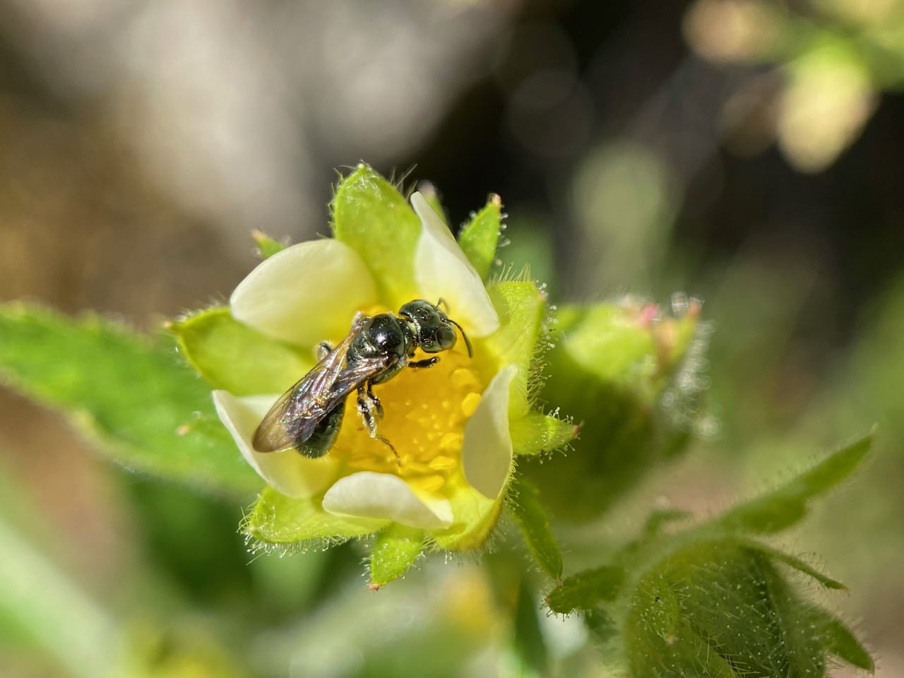 A Small Carpenter Bee, Ceratina sp. (family Apidae) is foraging on a flower of Sticky Cinquefoil, Drymocallis glandulosa.