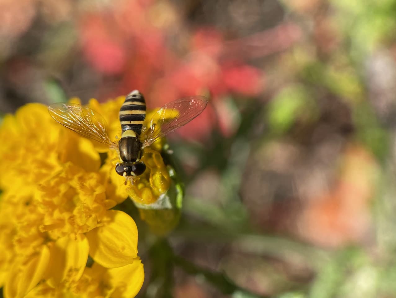 Nearby, a female Diamond Spottail Hoverfly, Fazia micrura is visiting the same flowers. Both sexes have the diamond spots, but the females are distinguished by her broader abdomen, and also by the space between her compound eyes. Males have holoptic eyes that meet along a central line atop the head.