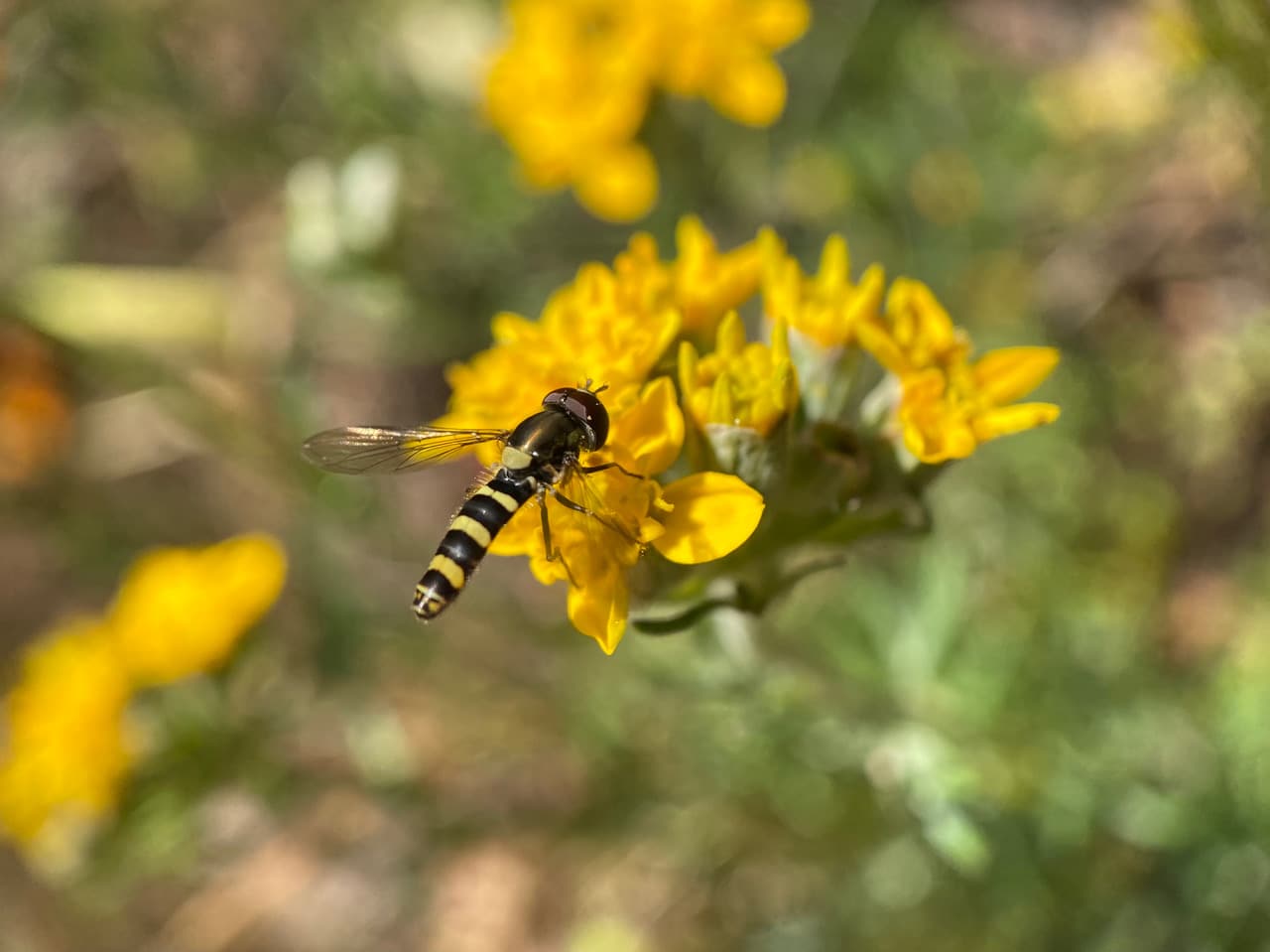 A male Diamond Spottail Hoverfly, Fazia micrura (family Syrphidae) visits the flowers of Golden Yarrow, Eriophyllum confertiflorum. There are four diamond-shaped yellow markings near the tip of the tail.