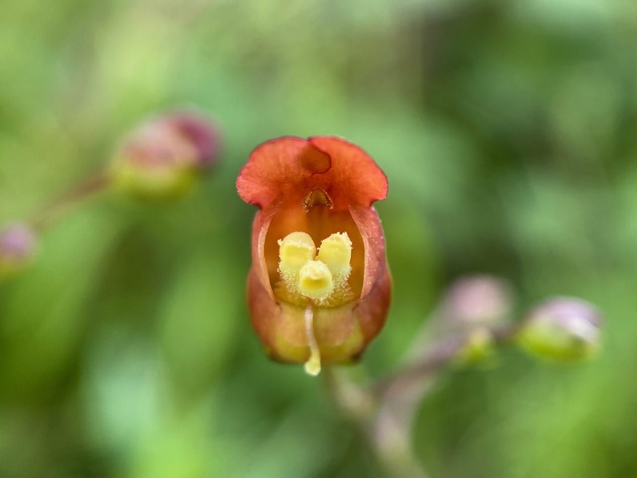 The flower pictured here is in the female phase, with a mature, receptive stigma. The stamens are not yet mature; only one of the four fertile anthers have appeared in the front of the throat, and is not yet dispensing pollen. Nectar is already produced to entice pollinators to visit and deposit pollen from other more mature flowers. Dichogamy (separation of genders in time) is a floral strategy for avoiding self-pollination.