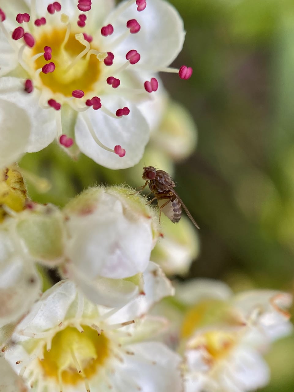 A Small Fruit Fly, Drosophila sp.(family Drosophilidae) is perched quietly on a flower bud of Pacific Ninebark.
