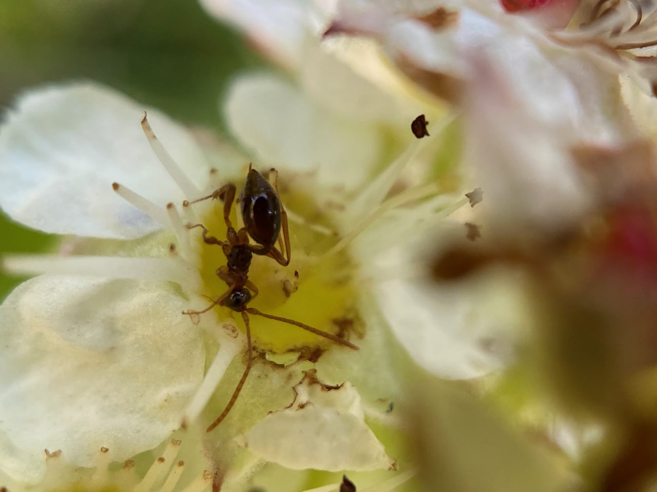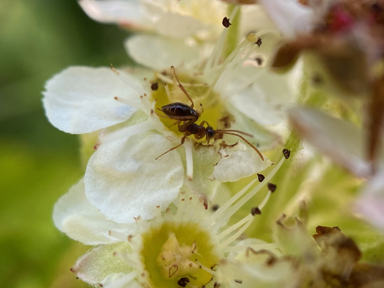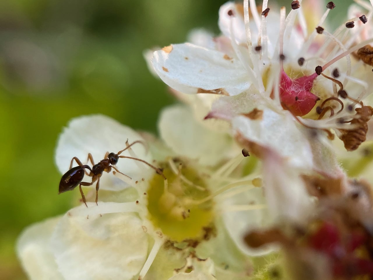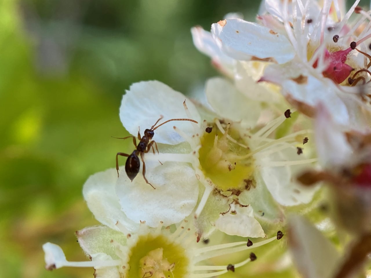 It’s hard to walk past the blooming Pacific Ninebark, Physocarpus capitatus without checking the insects on the flowers. I find the usual visitors, then my attention is hijacked by an insect that appears at first to be an American Winter Ant, Prenolepis imparis. But the antenna are long and not elbowed, as in the ants! It’s probably a wasp! A wingless wasp??