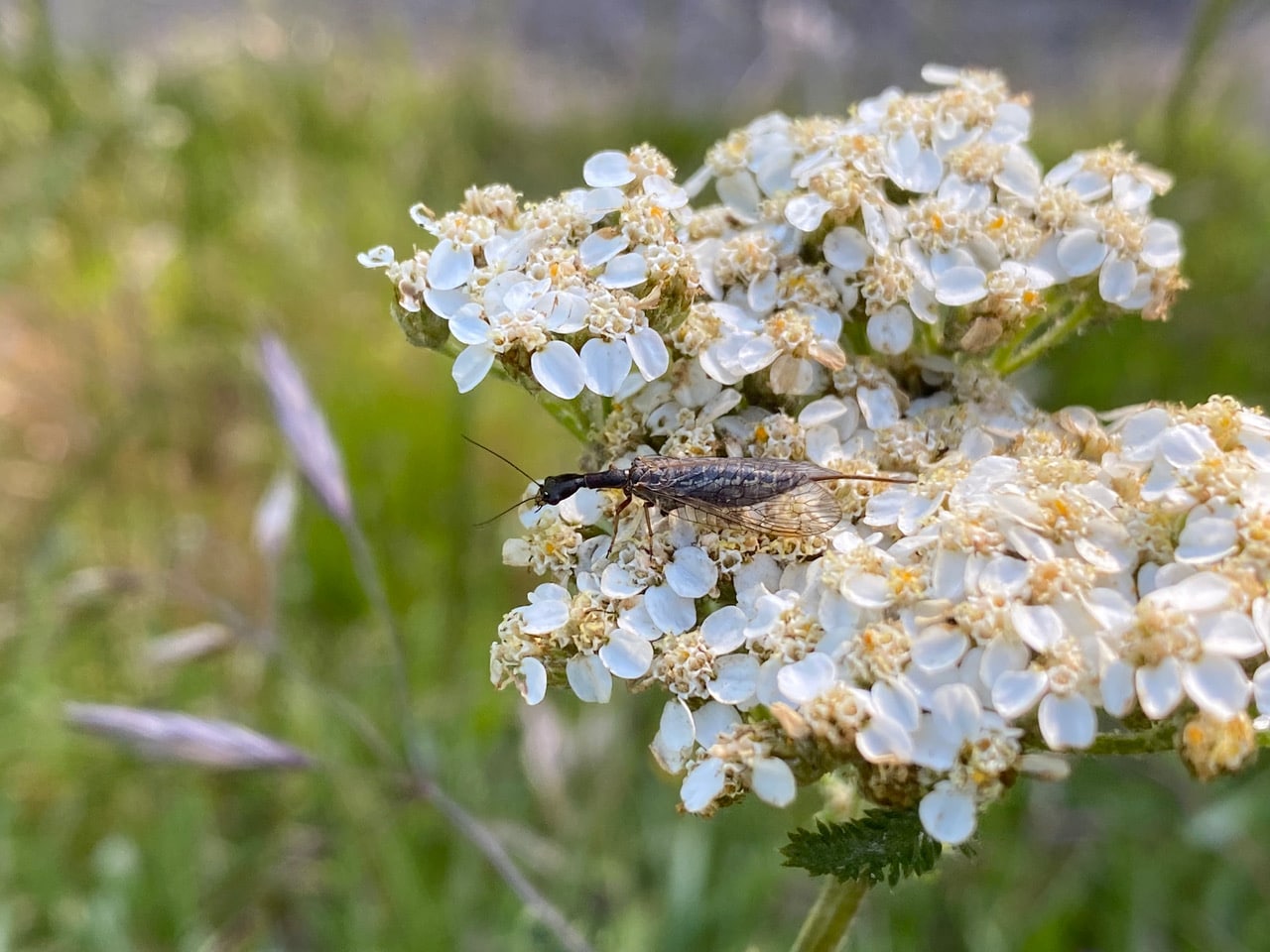 A female Snakefly is hunting on an inflorescence of Yarrow, Achillea millefolium.