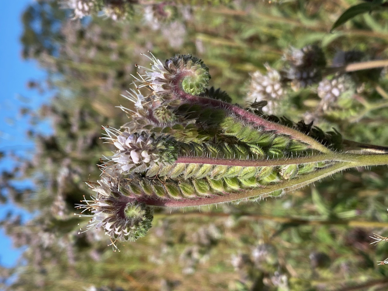 The season is advancing fast. One can almost tell time by how much the scorpionoid cymes of the Calfornia Phacelia, Phacelia californica have uncoiled. Long rows of fruits are developing along the straightened cymes below the remaining flowers.