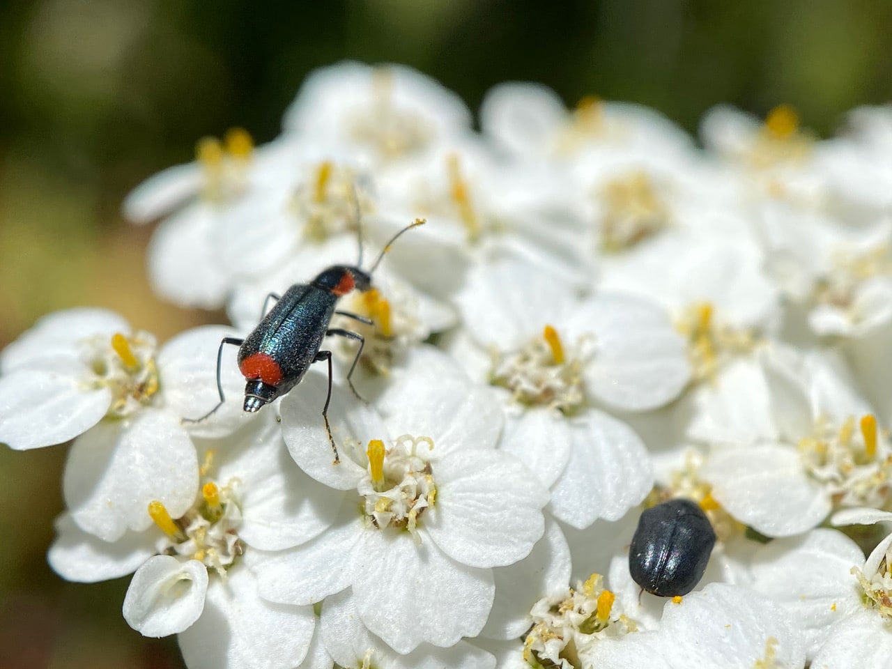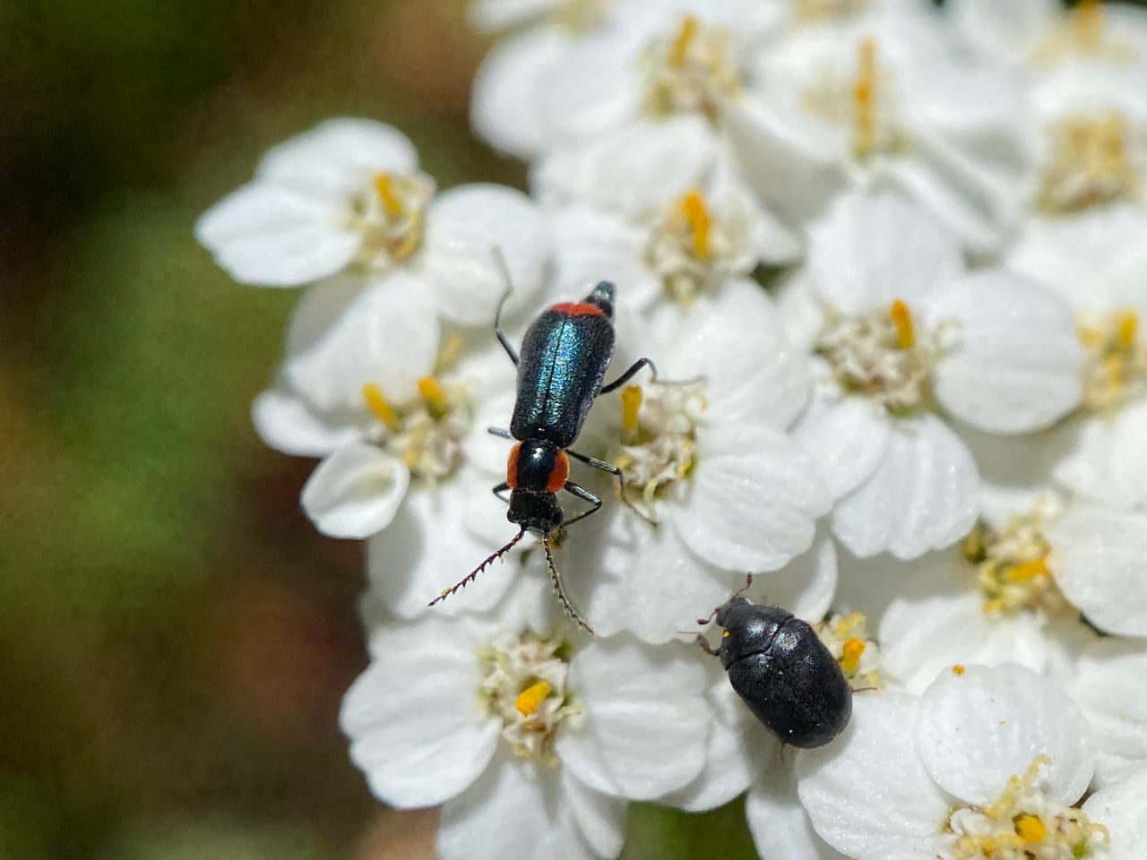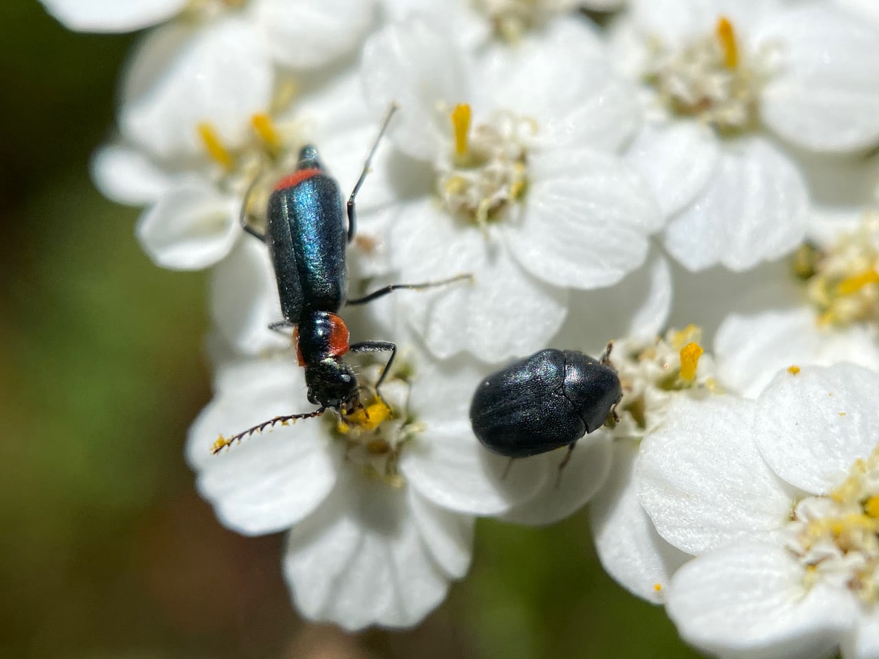 A Malachite Beetle, Malachius auritus (family Melyridae, subfamily Malachiinae) approaches a Skin Beetle, Cryptorhopalum sp. (family Dermestidae) on an inflorescence of Yarrow.
