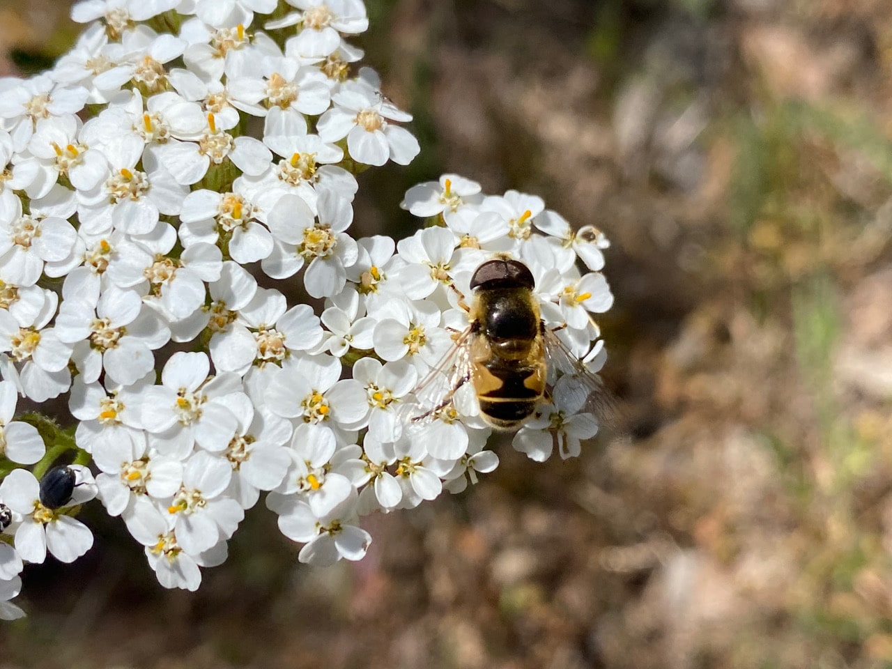 A Black-footed Drone Fly, Eristalis hirta visits in inflorescence of Yarrow.