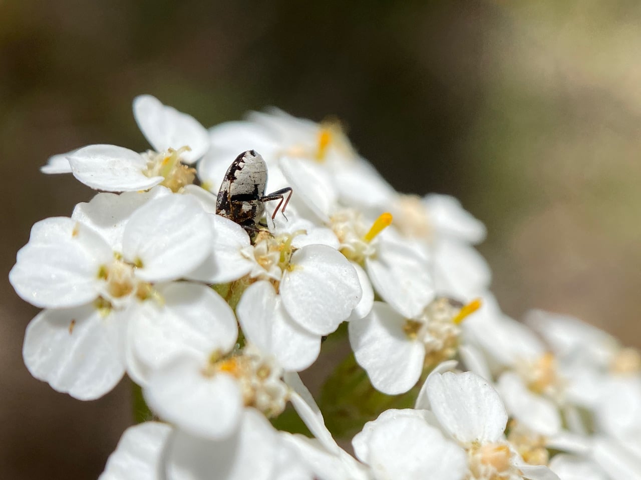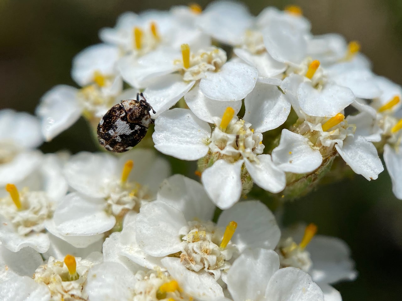 A Skin Beetle, Anthrenus lepidus (family Dermestidae) is roaming an inflorescence of Yarrow.