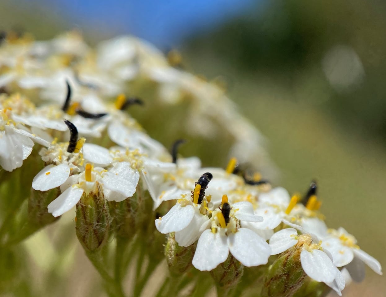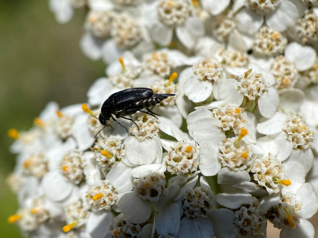A Tumbling Flower Beetle (family Mordellidae) is foraging on an inflorescence of Yarrow.