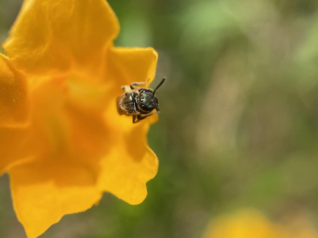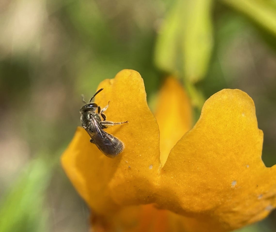 A little bee crawls out of a Sticky Monkeyflower, and looks out from the edge of a petal.