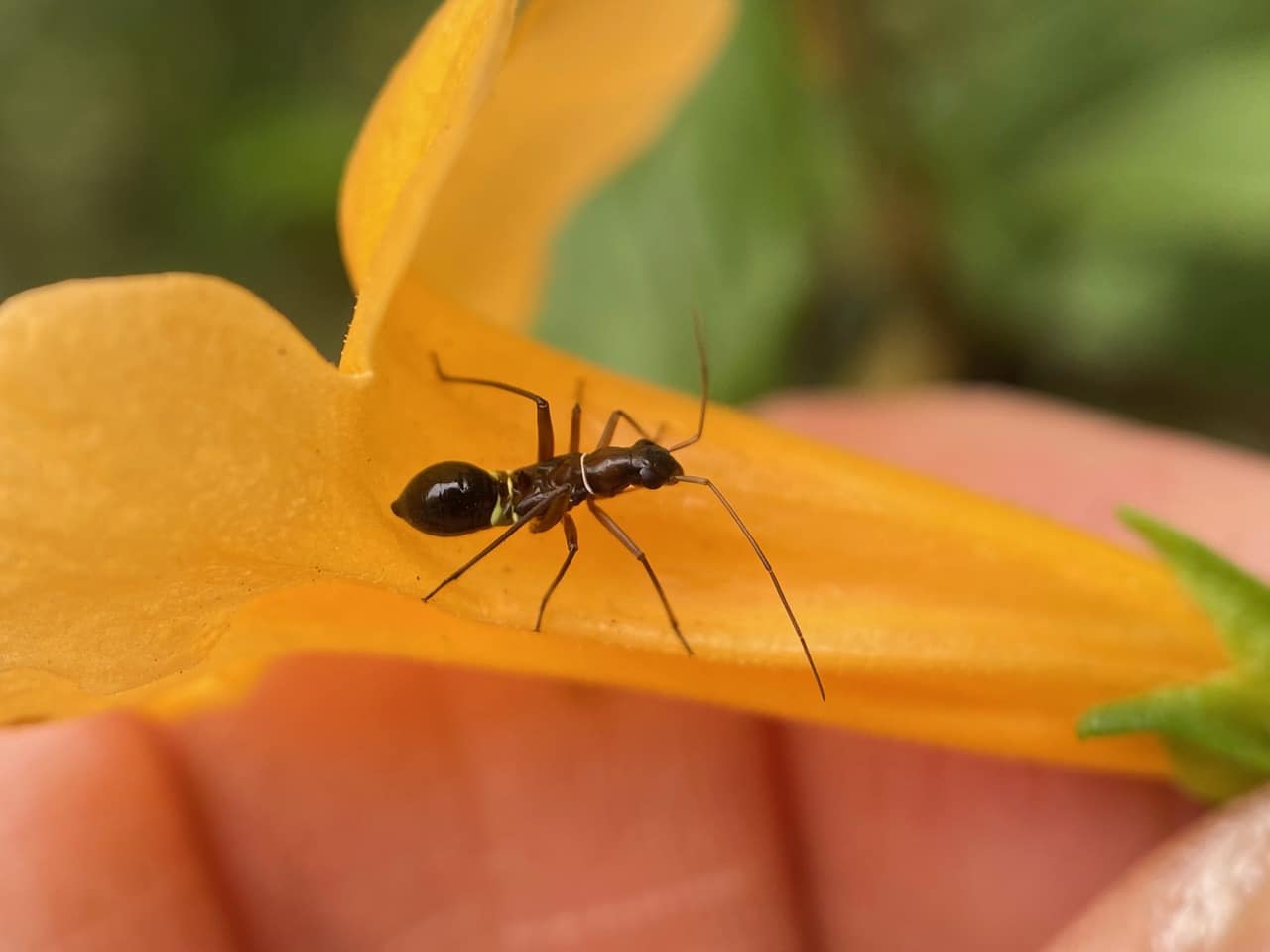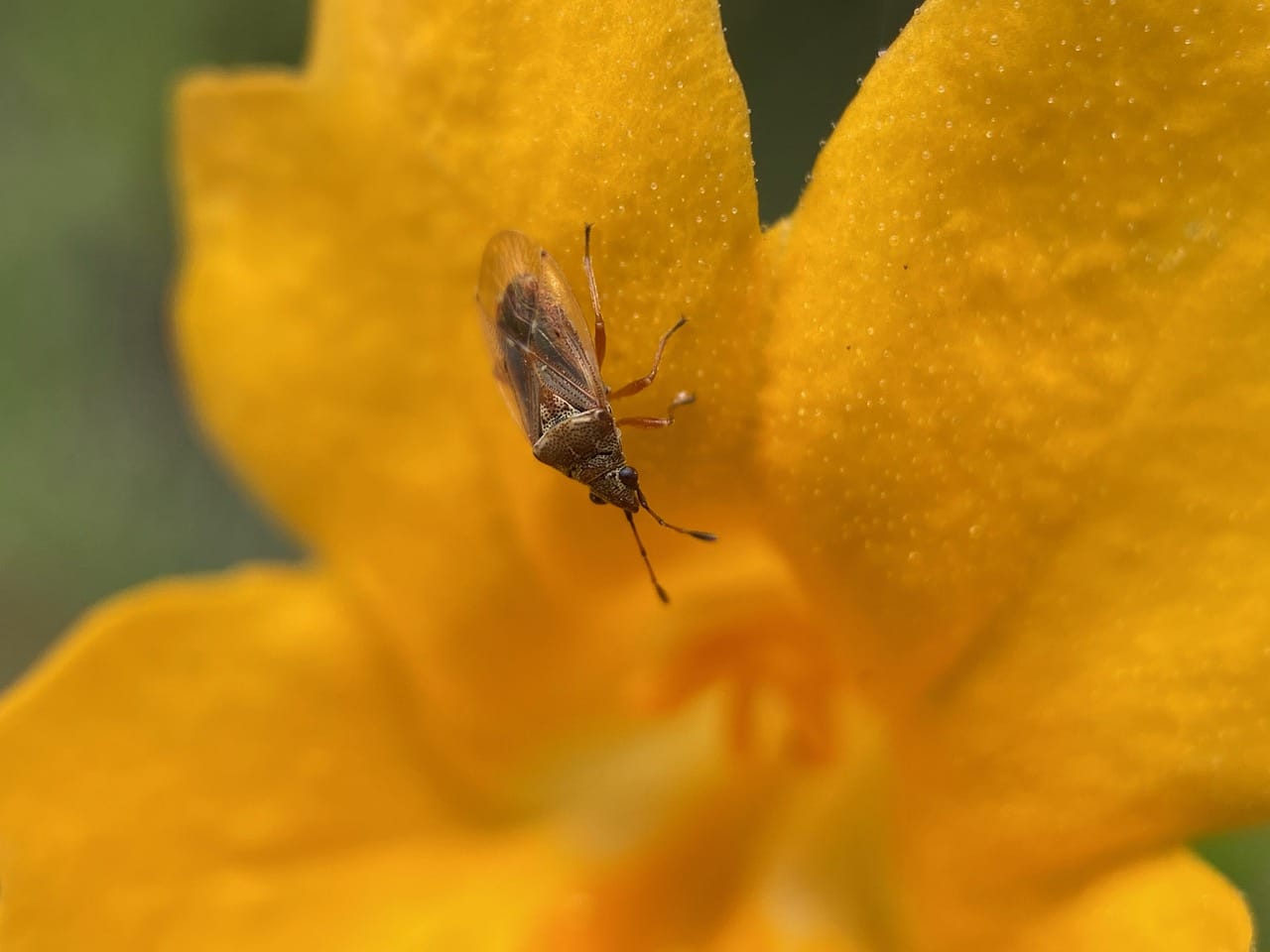 An ant-like insect crawls out of a Sticky Monkeyflower and runs to the back of the flower. Except for its long antennae and the yellow markings on its body, the insect could easily be mistaken for an American Winter Ant. It is in fact a young Plant Bug, Closterocoris amoenus (family Miridae), native to Central and North America. I see these ant-like nymphs every year, mostly on Sticky Monkeyflower. The adults also seem to have an affinity for the plant.