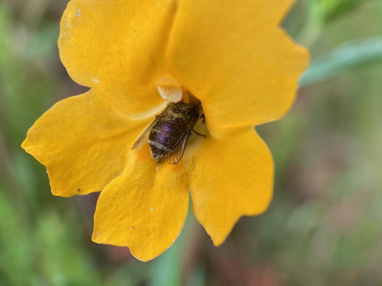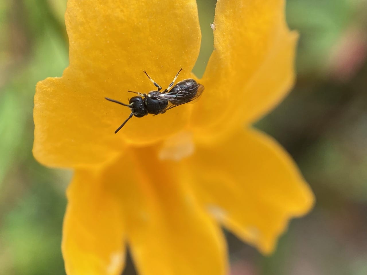 A shiny black bee is about to enter a Sticky Monkeyflower. She has very modest scopae on her hind legs. The bee is a Small Carpenter Bee, Ceratina sp. (family Apidae).