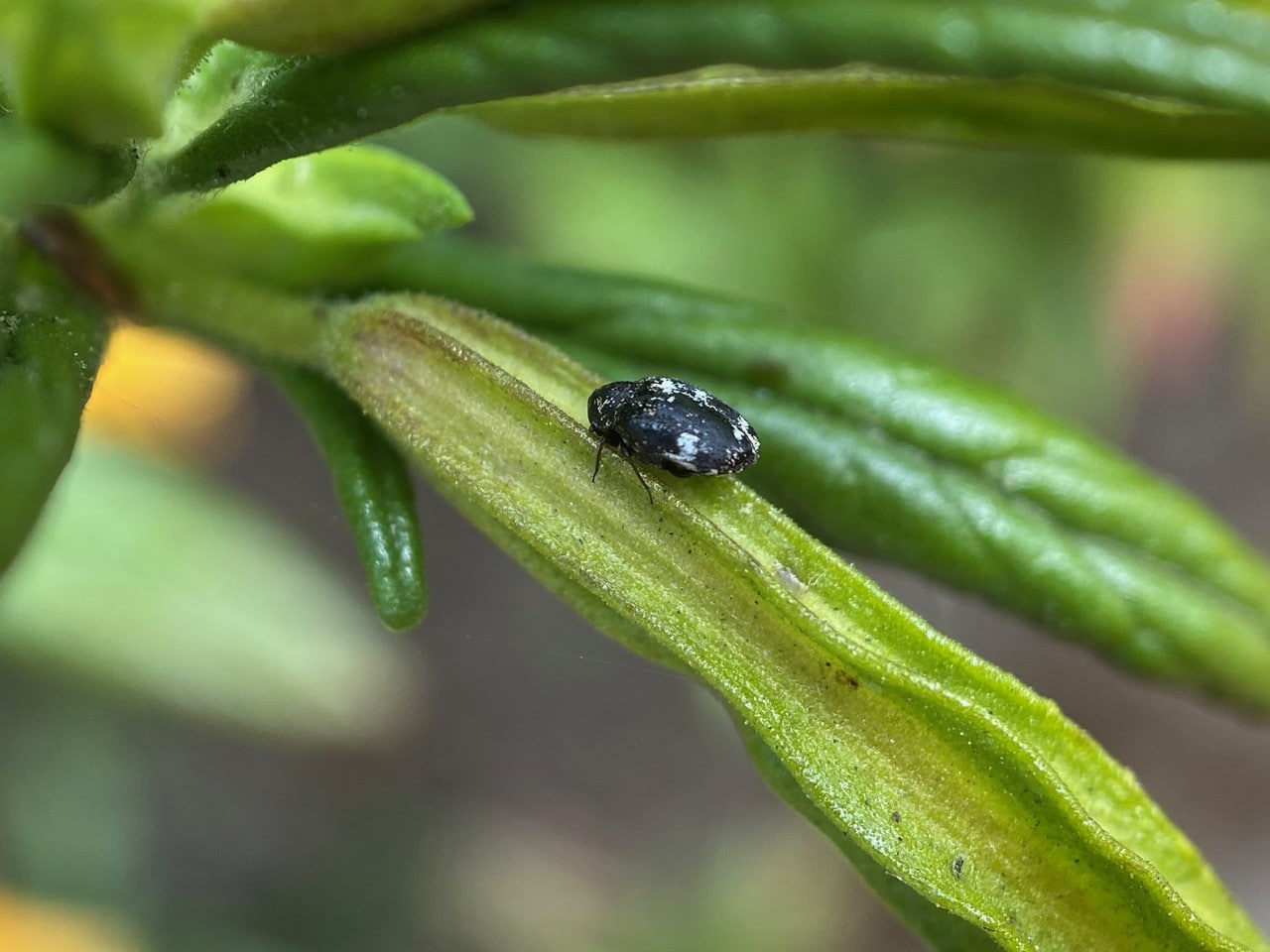 A Skin Beetle, Anthrenus lepidus (family Dermestidae) is resting on the calyx of a Sticky Monkeyflower. Rather surprising to see it here, as these beetles are normally seen among flowers feeding on pollen.