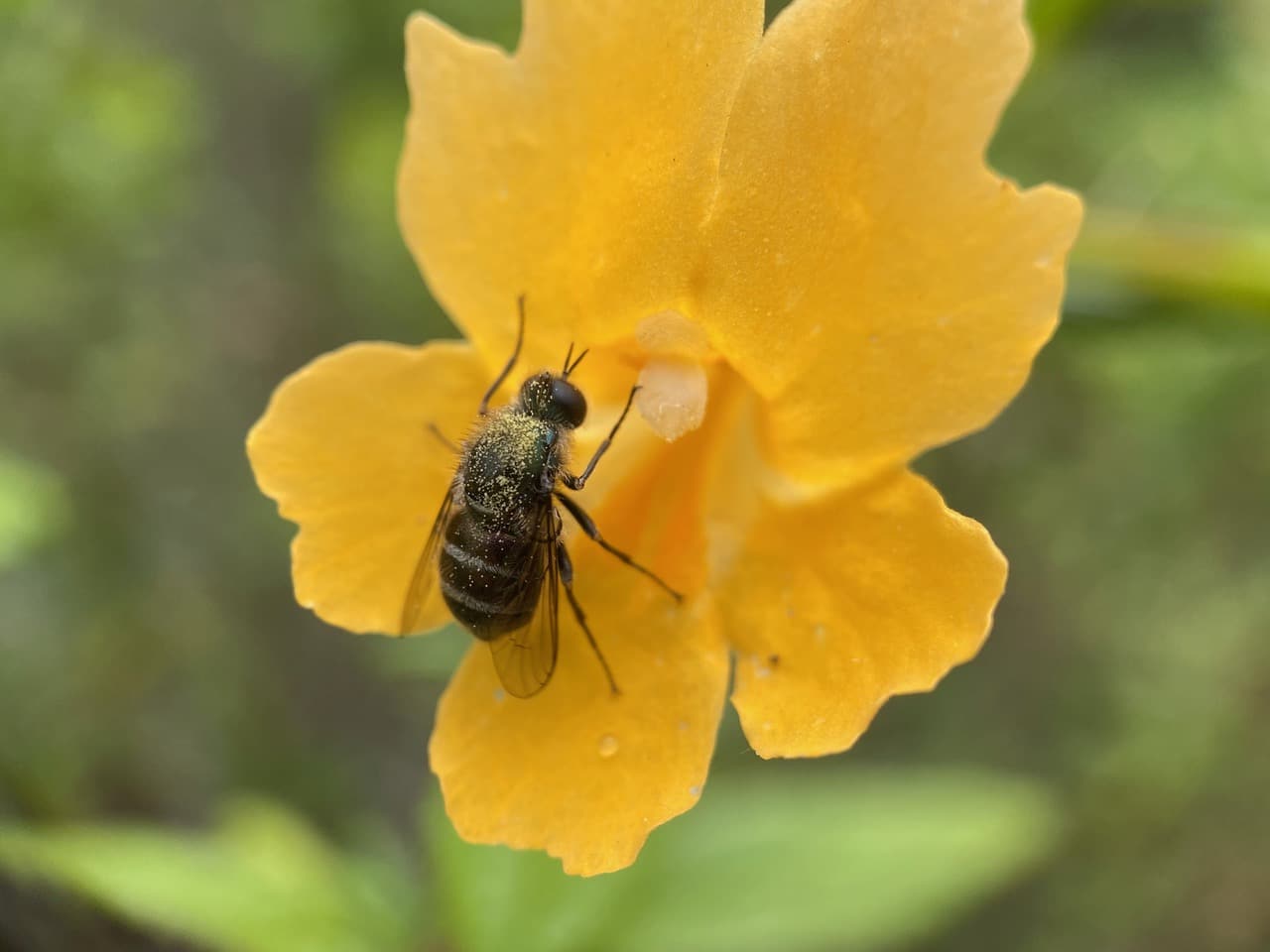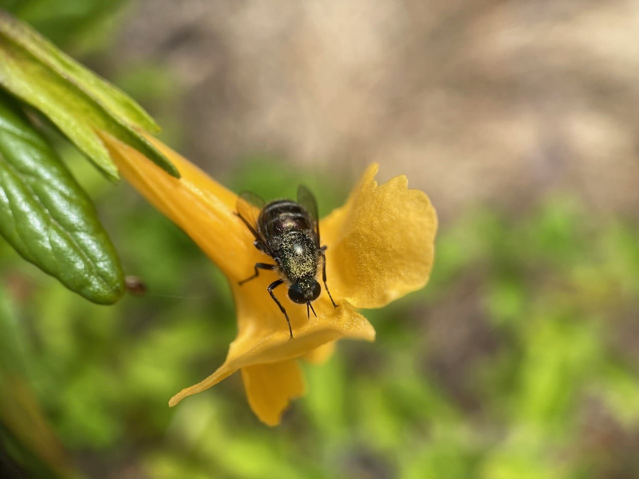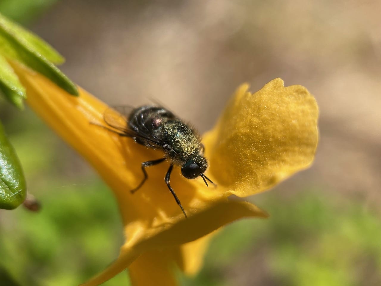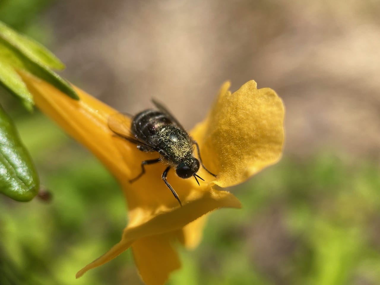 Here’s a Small-headed Fly perched motionless outside a Sticky Monkeyflower. I think it just woke up. Note that its back is dusted with pollen that has fallen from the stamens on the roof of the floral tube while the fly was sleeping inside.