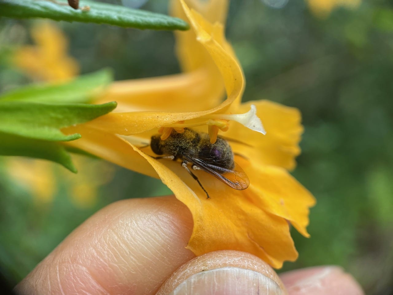 Here’s good look at the Masked Bee’s face as she lifts off from the upper petal.