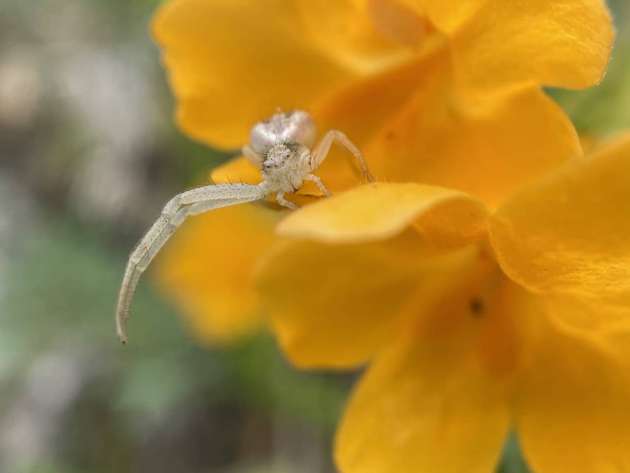 What a disturbing sight – a Crab Spider, Mecaphesa sp. (family Thomisidae) missing its two front legs on the same side. Crab Spiders do not spin webs to trap prey. They are ambush predators that sit and wait on or near flowers for an unsuspecting insect to come within reach of its two front pairs of extra long legs. What is this poor spider going to eat when it can’t grab its prey? It looks like a young spider, with a few more molts before reaching adulthood. There’s hope yet that it might be able to regenerate those lost limbs on subsequent molts, if it doesn’t die of starvation first.