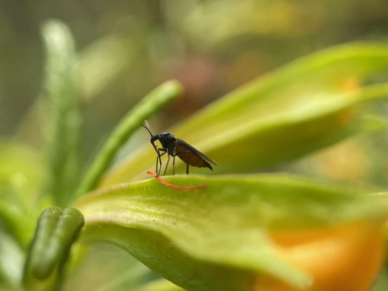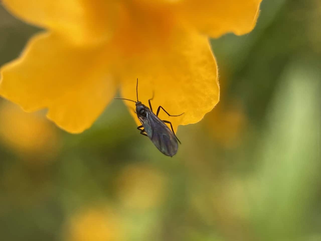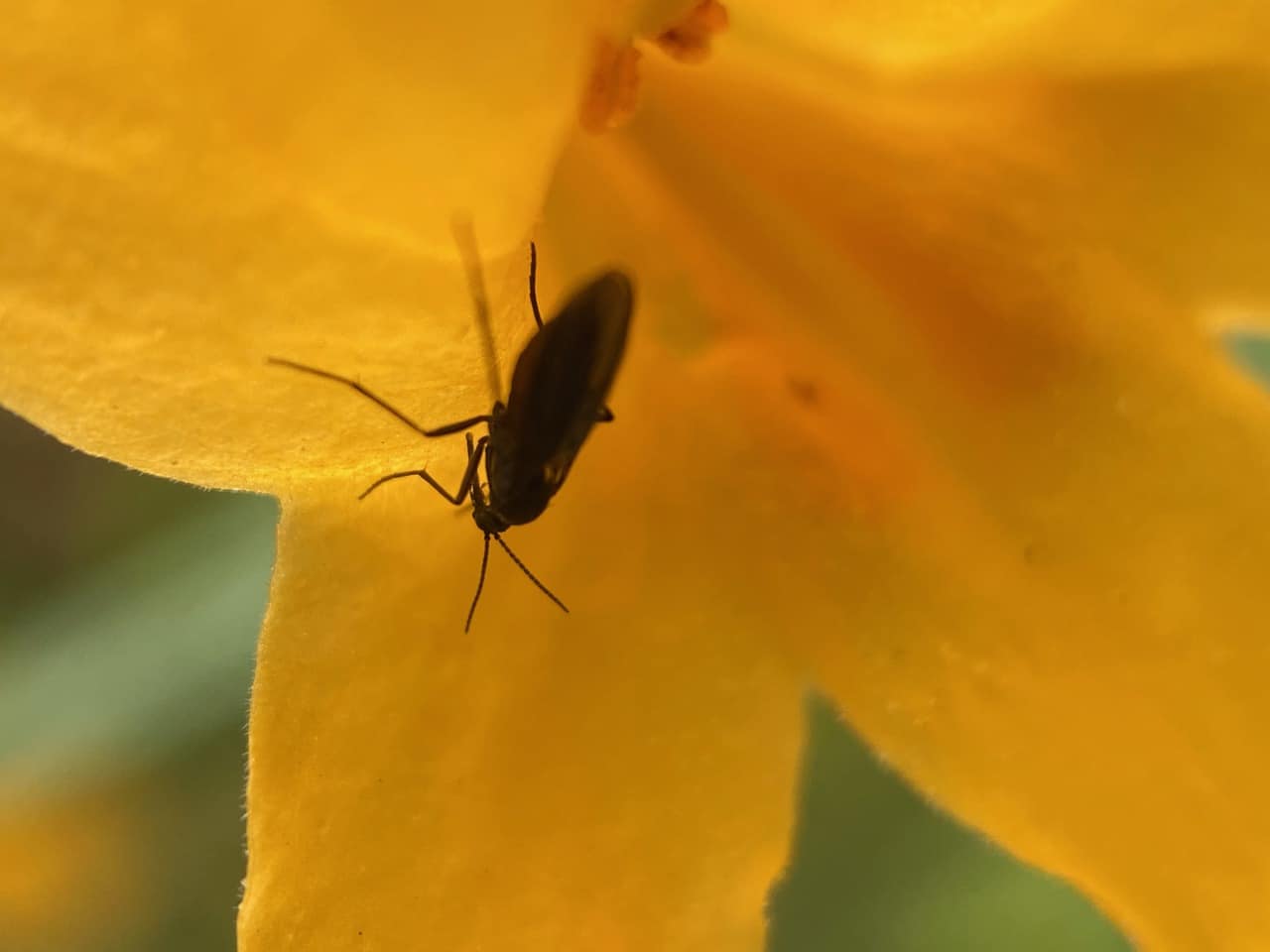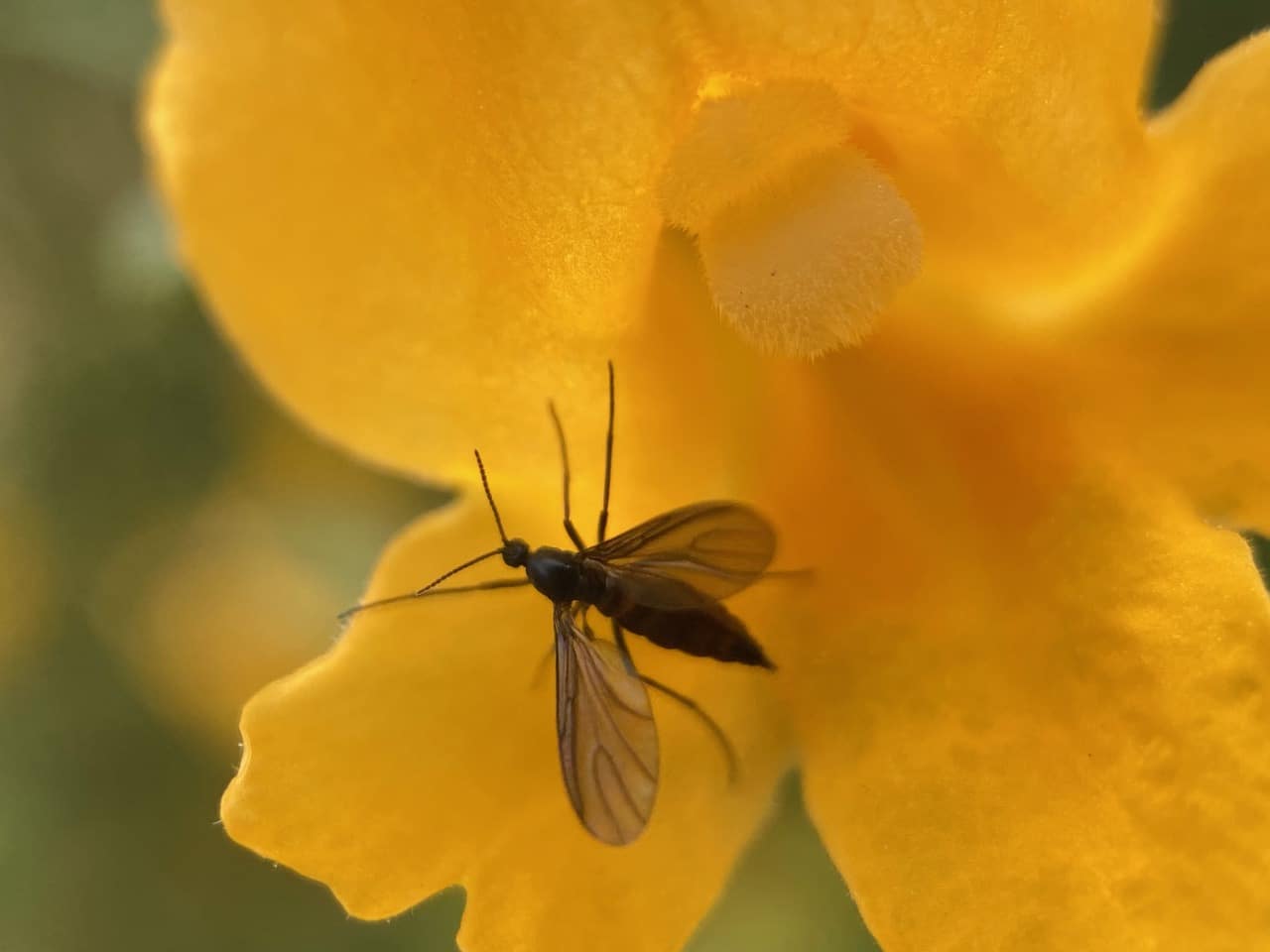A Dark-winged Fungus Gnat is perched on the calyx of a Sticky Monkeyflower.