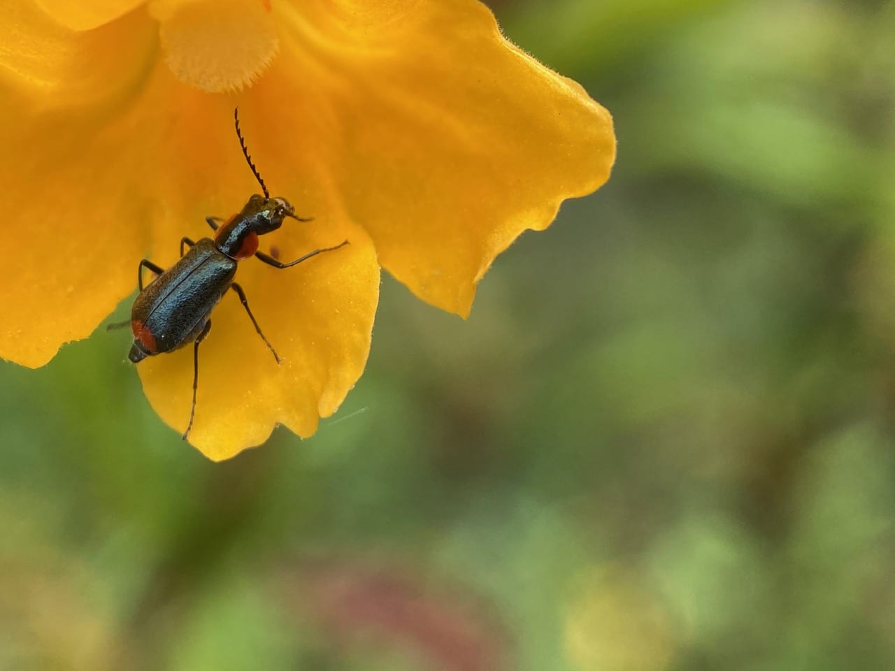 A Malachite Beetle, Malachius auritus (subfamily Malachiinae, family Melyridae) is posing on the lower lip of a Sticky Monkeyflower.