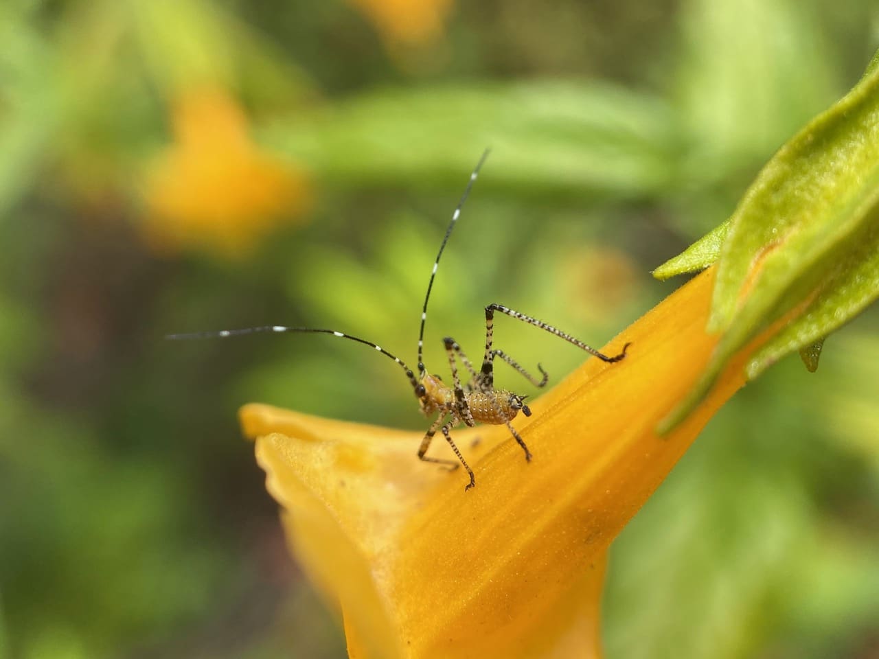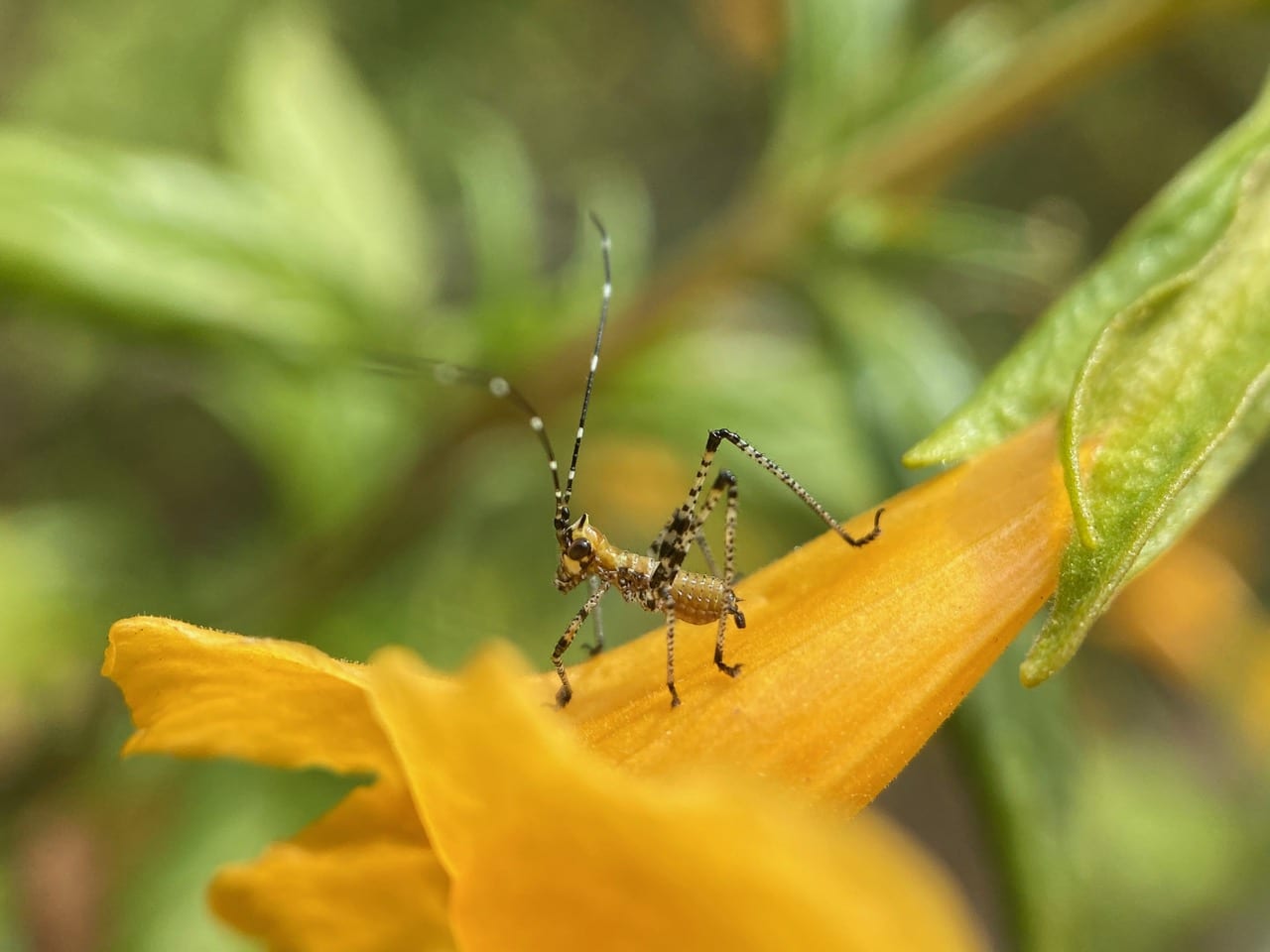 What a cutie! The young nymph of a Scudder’s Bush Katydid, genus Scudderia is posing atop a Sticky Monkeyflower. I am particularly charmed by its long, white-banded antennae.