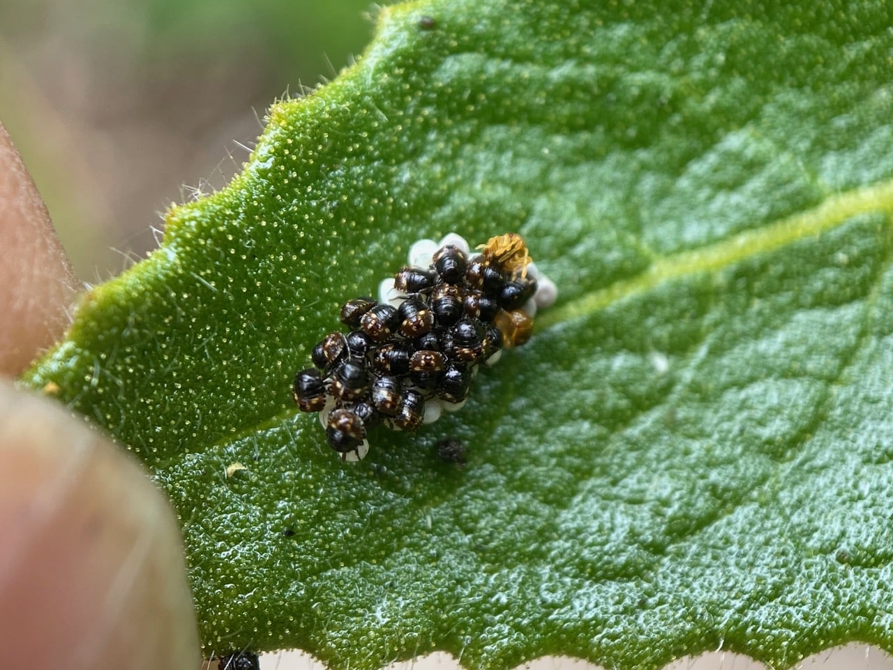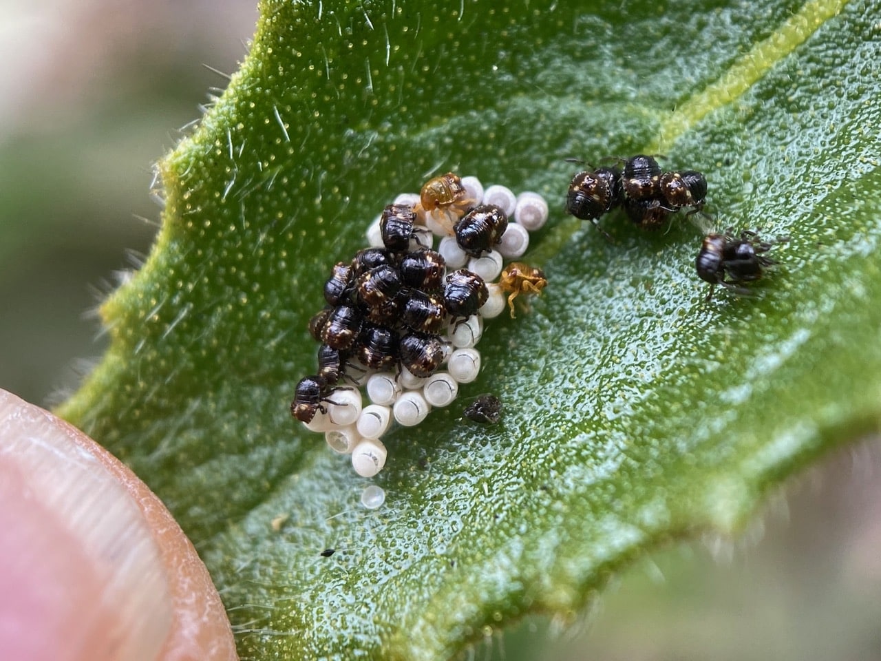 Near the tip of a Yerba Santa leaf, a clutch of Stink Bug eggs have hatched into dark, shiny nymphs, with two light-colored ones still emerging. At this stage, the hatchlings look more like beetles than bugs.